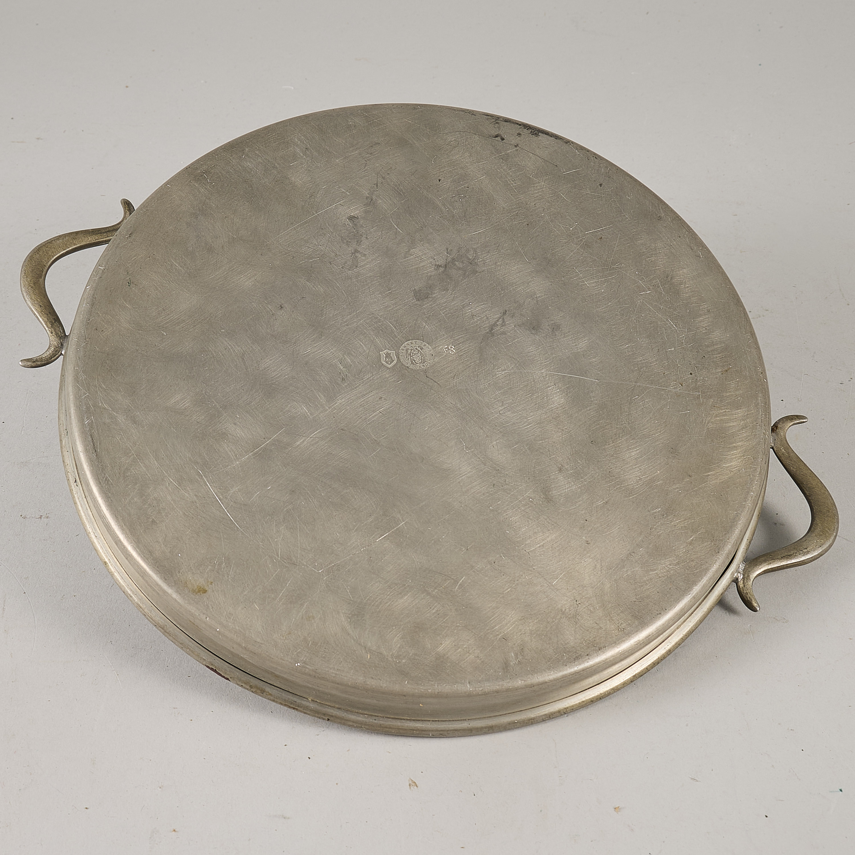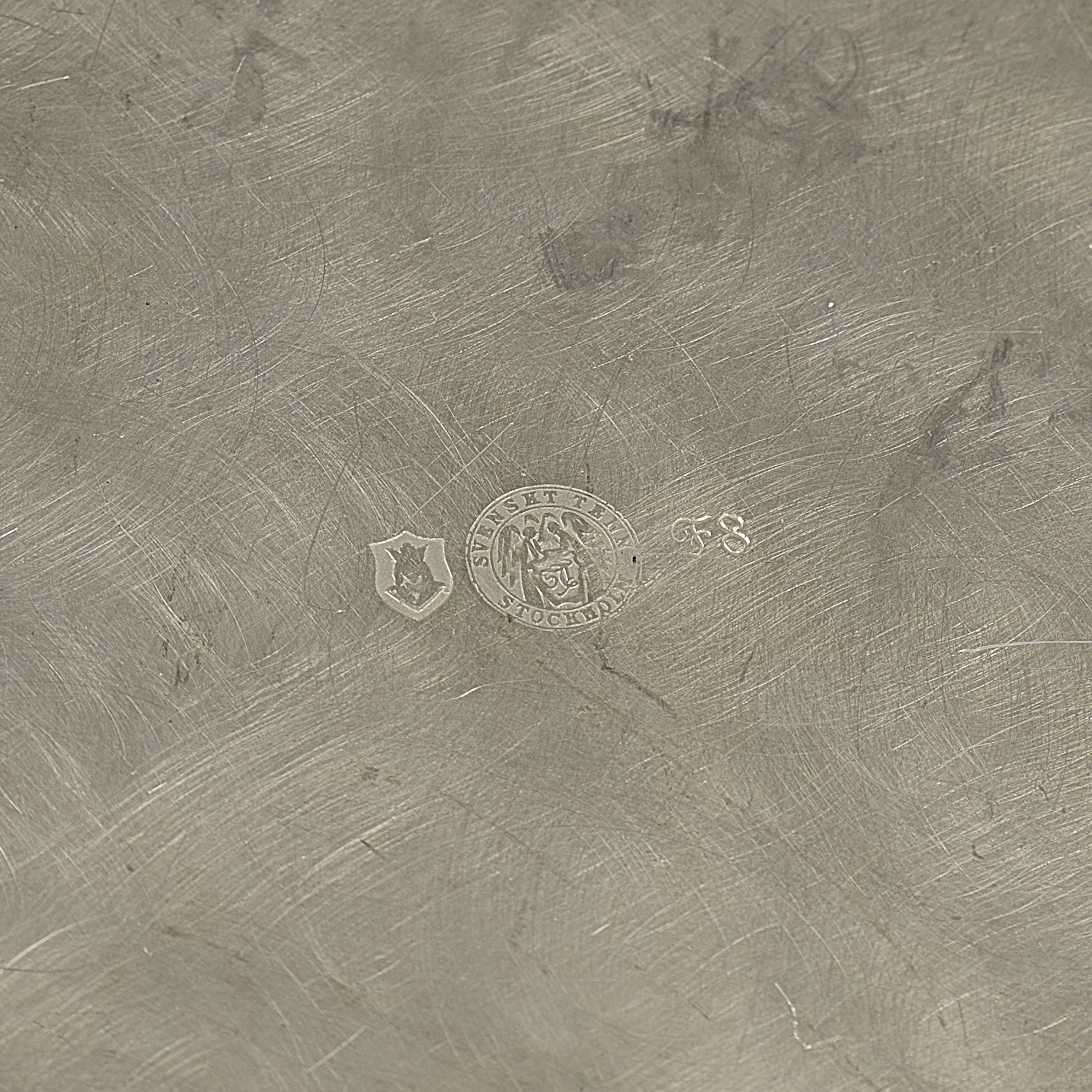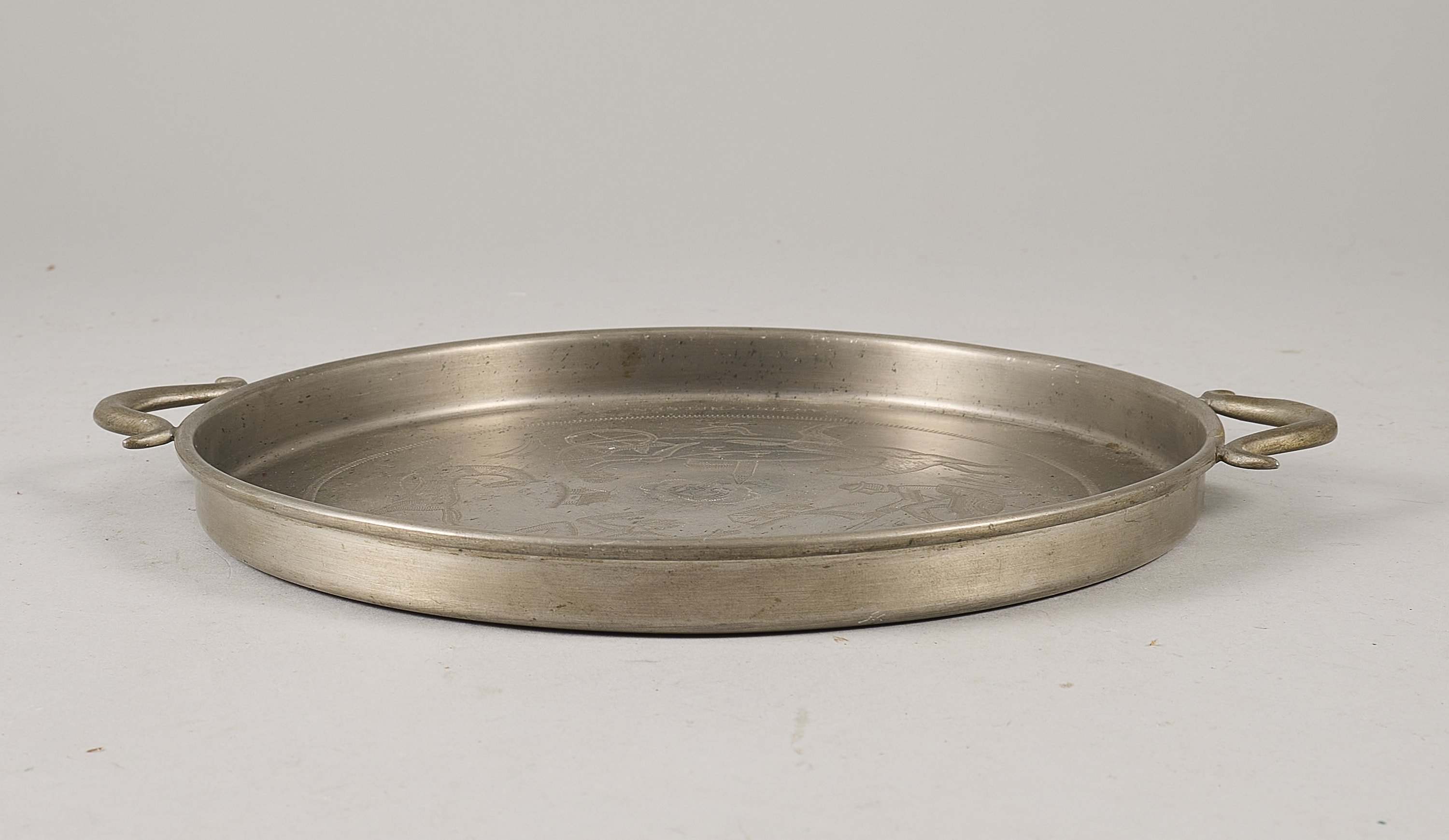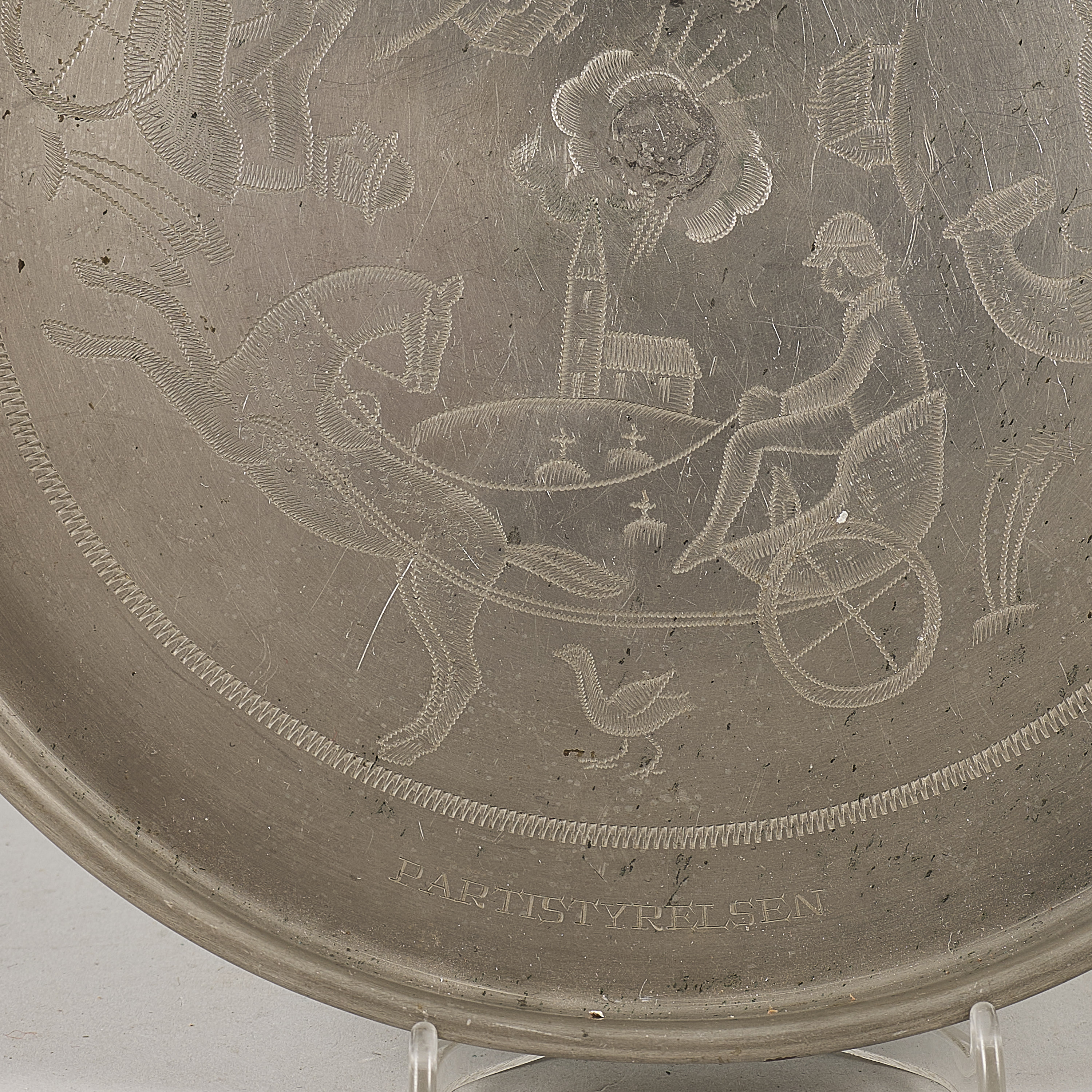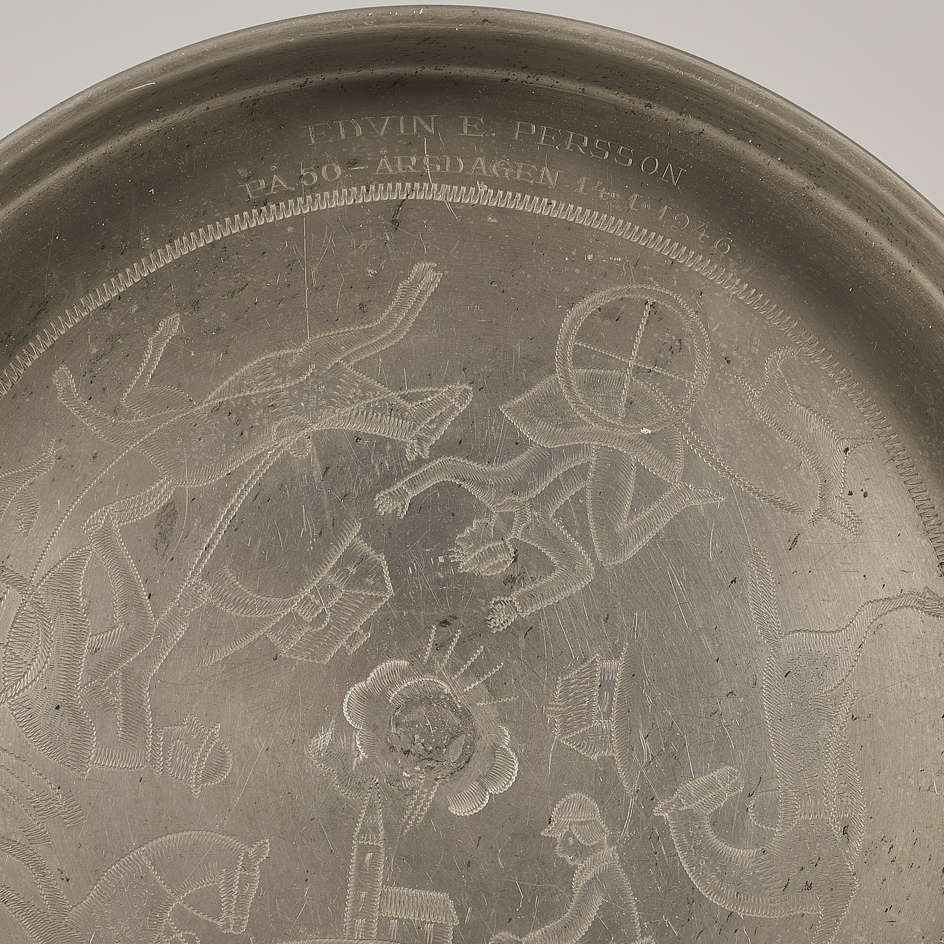 Firma Svenskt Tenn, Nils Fougstedt (1881-1954), Sverige. Tenn (F8), graverad dekor och med dedikatio. Diameter: 30 cm