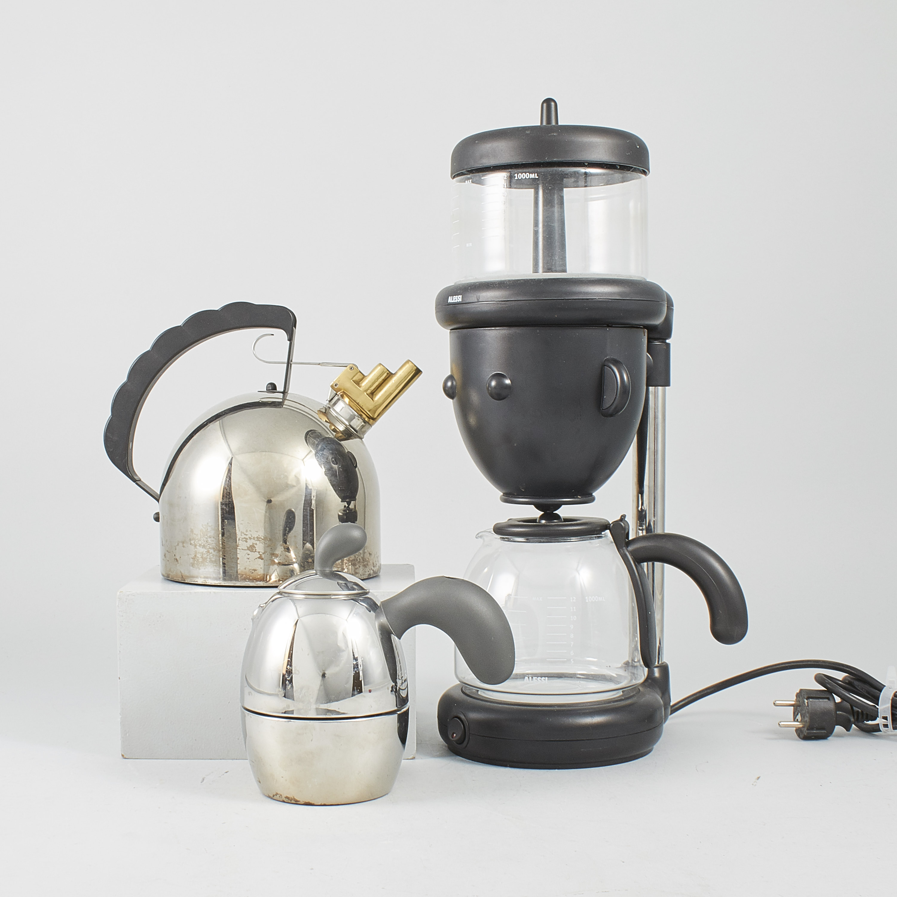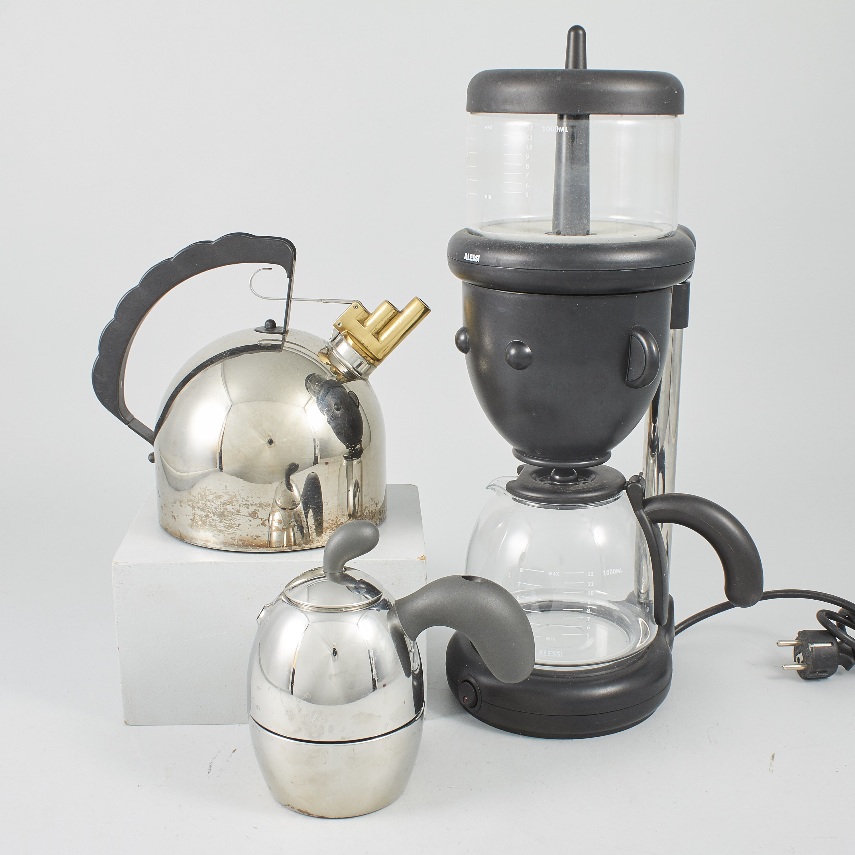 3 delar, Alessi. Vattenkokare, espressobryggare & kaffebryggare. Längd: 9-18 cm, djup: 9-18 cm, höjd: 15-43 cm