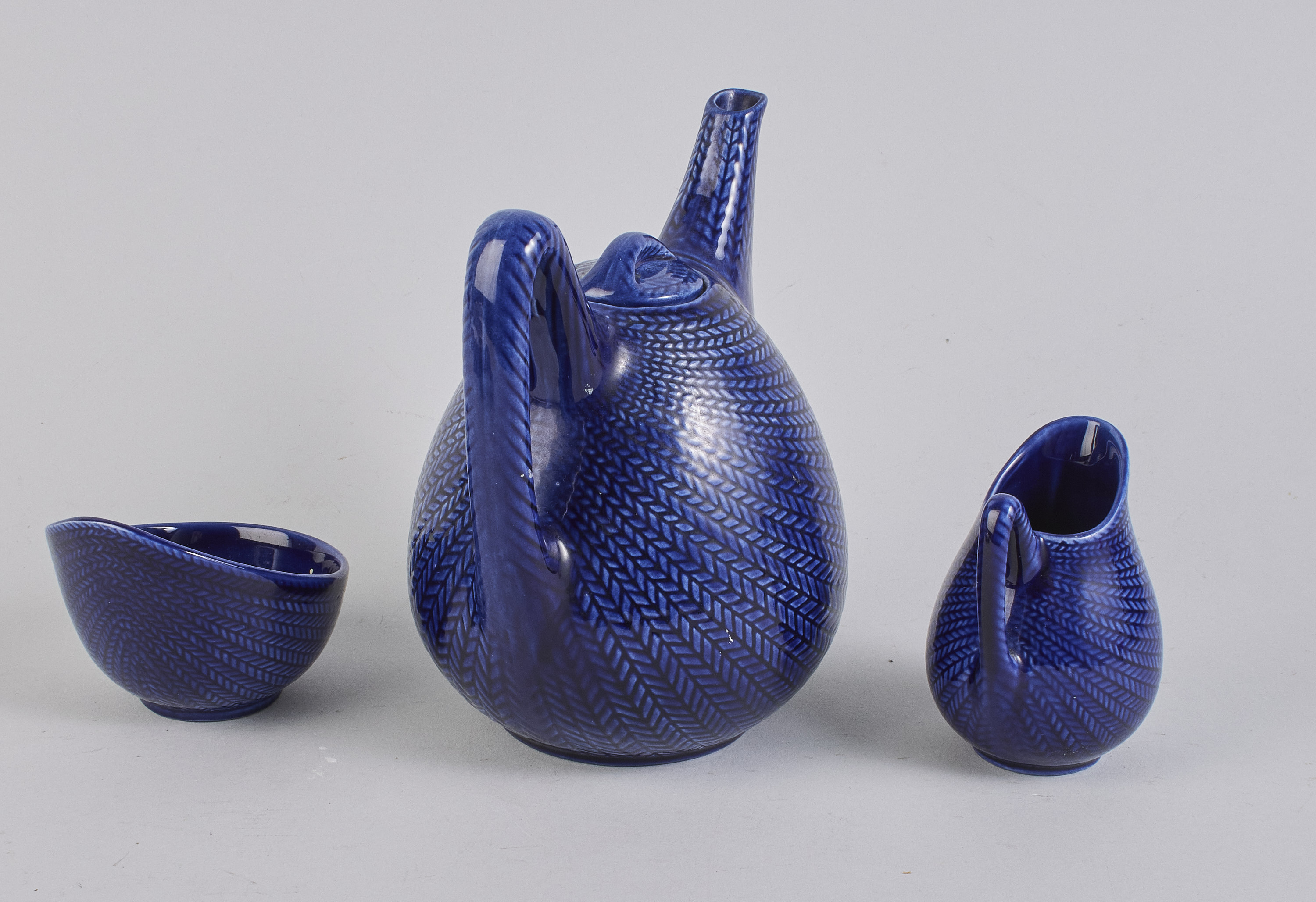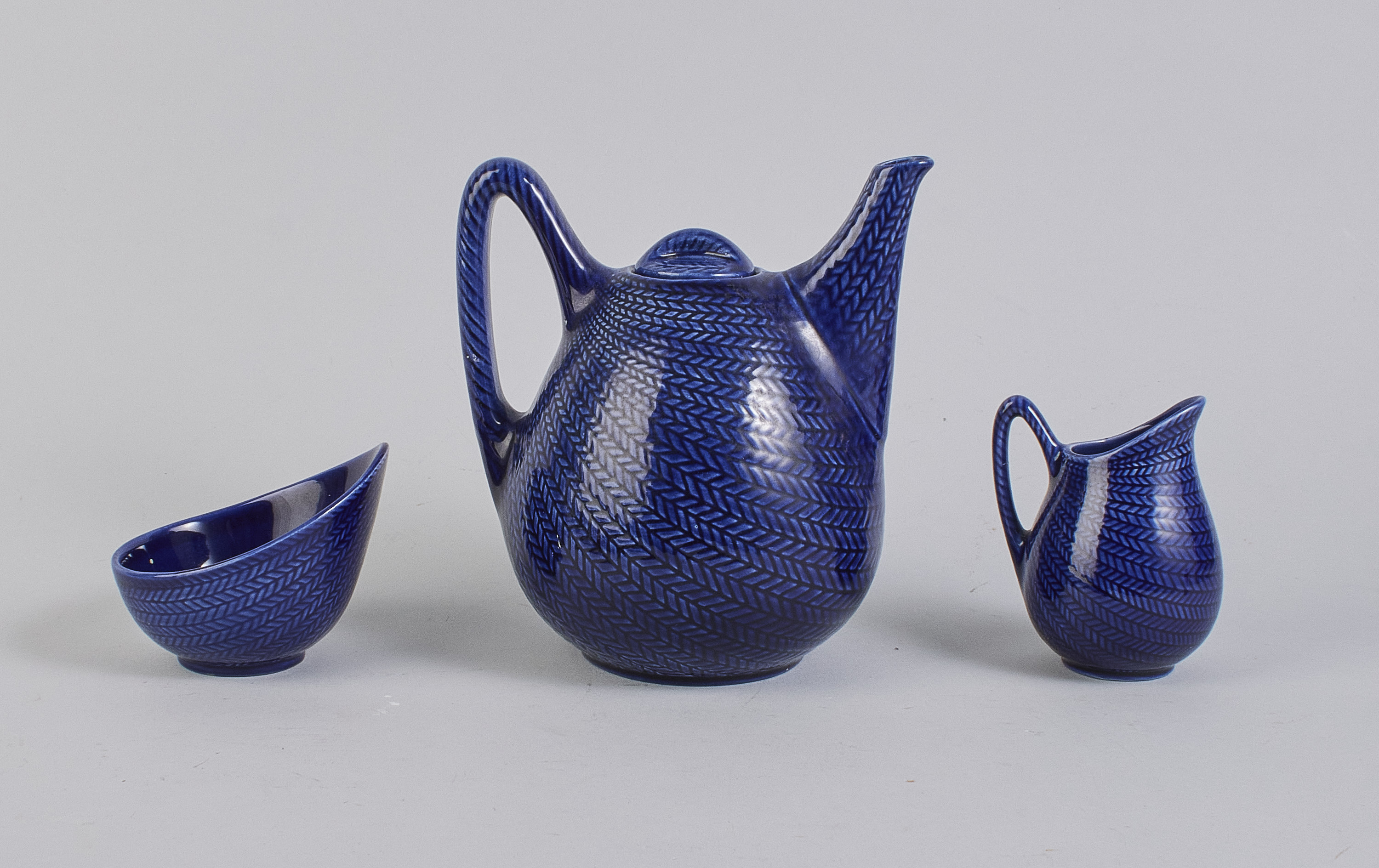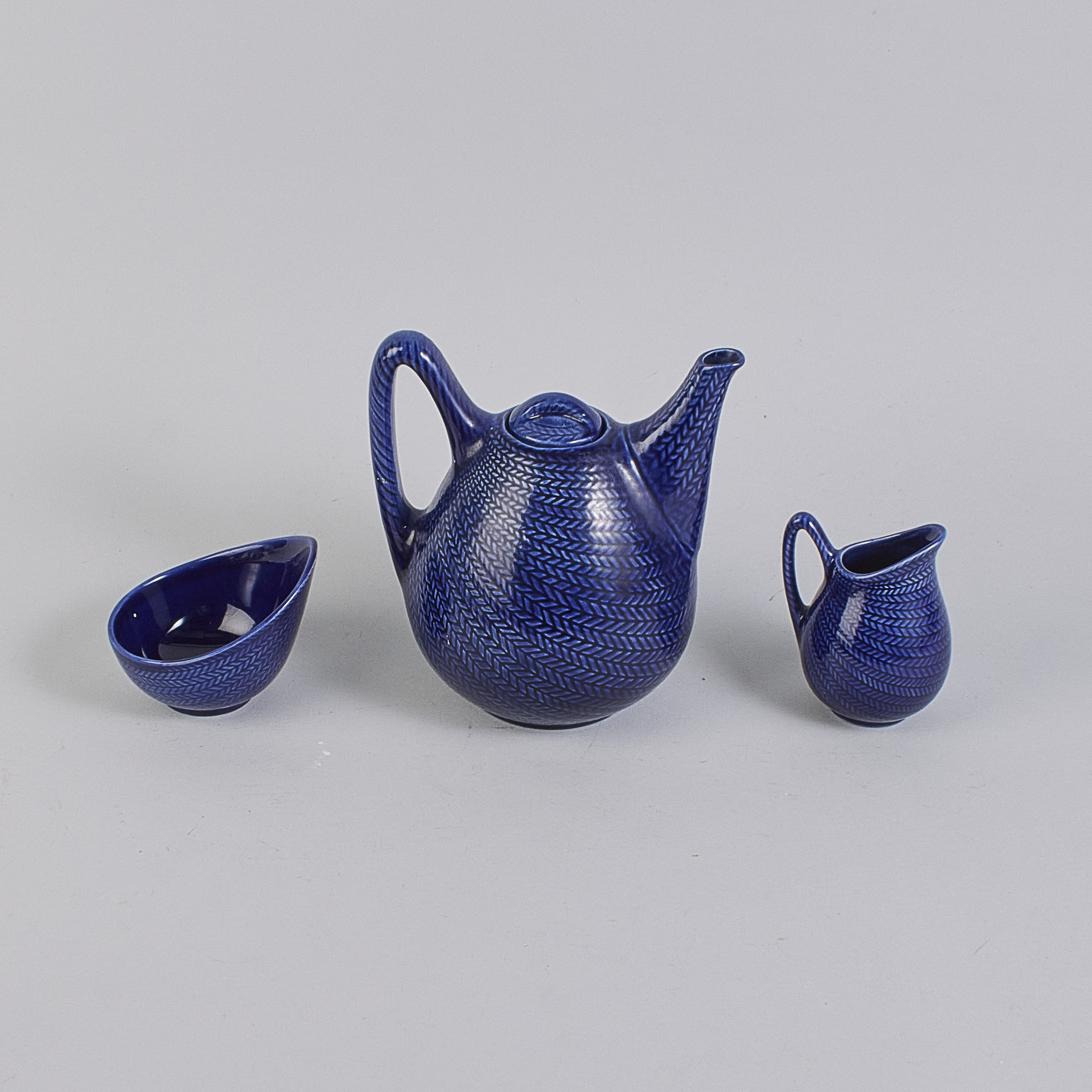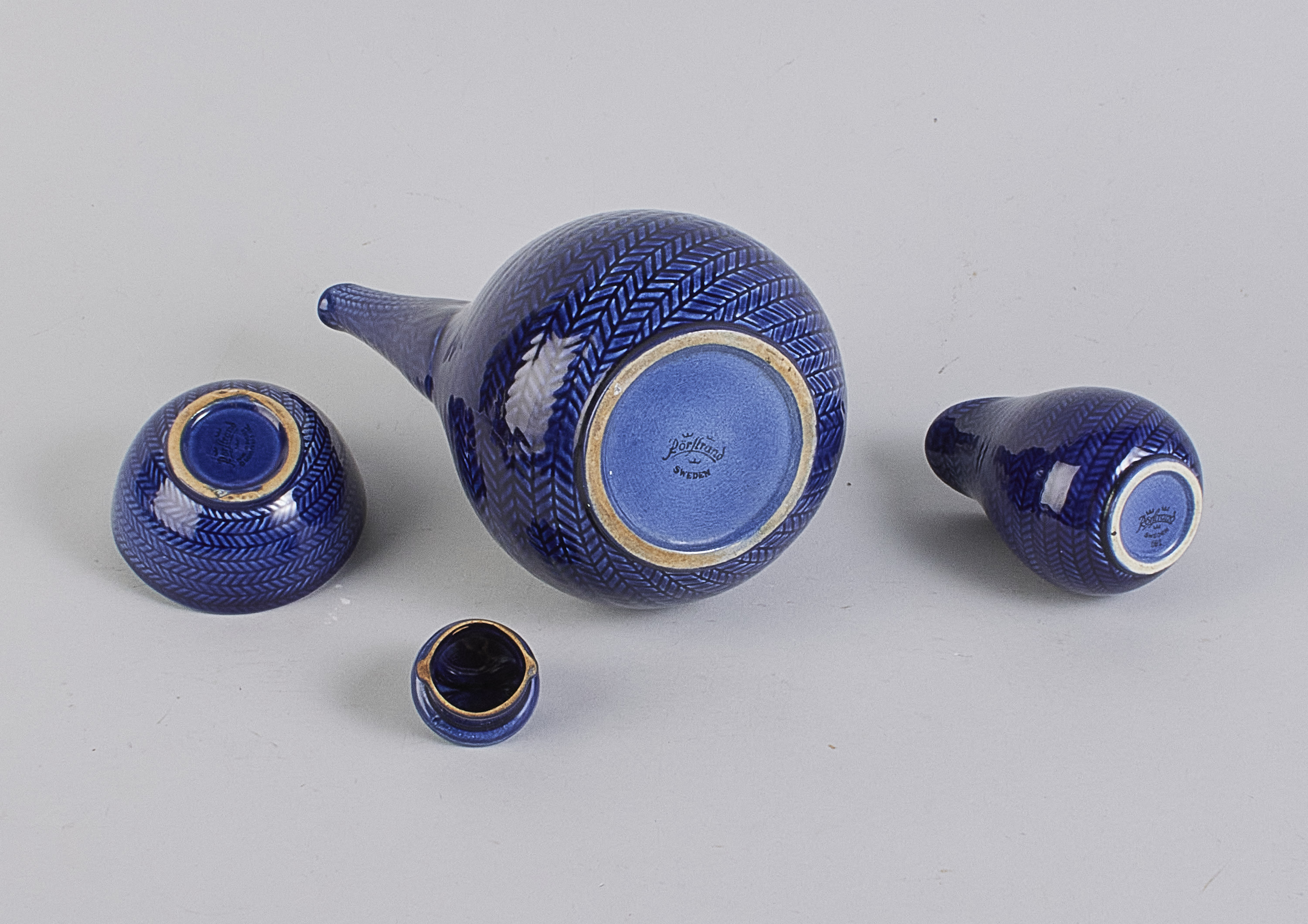 3 delar, Blå Eld, Hertha Bengtson (1917-1993), Sverige. Rörstrand, flintgods. Höjd: 8-19 cm
