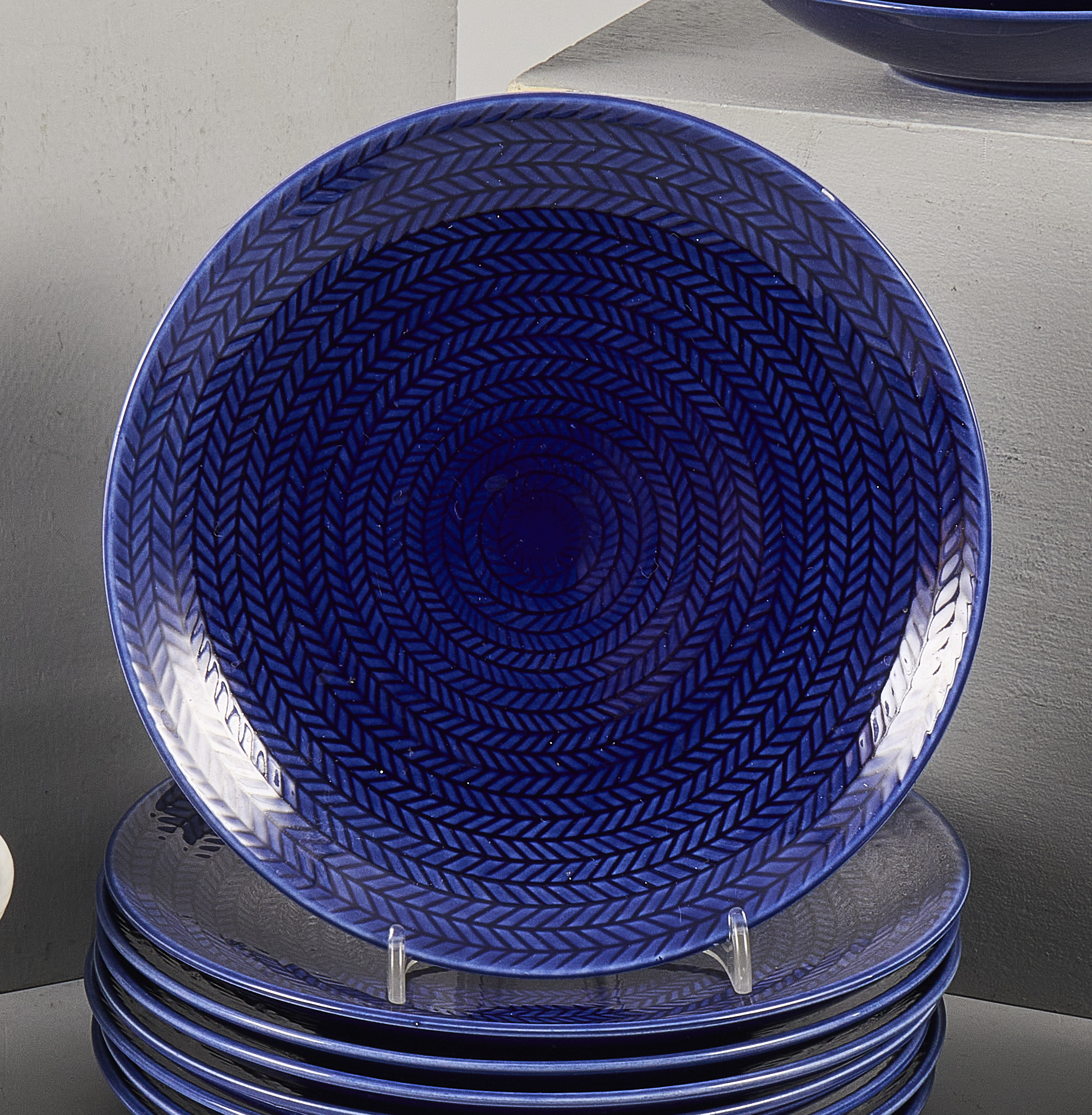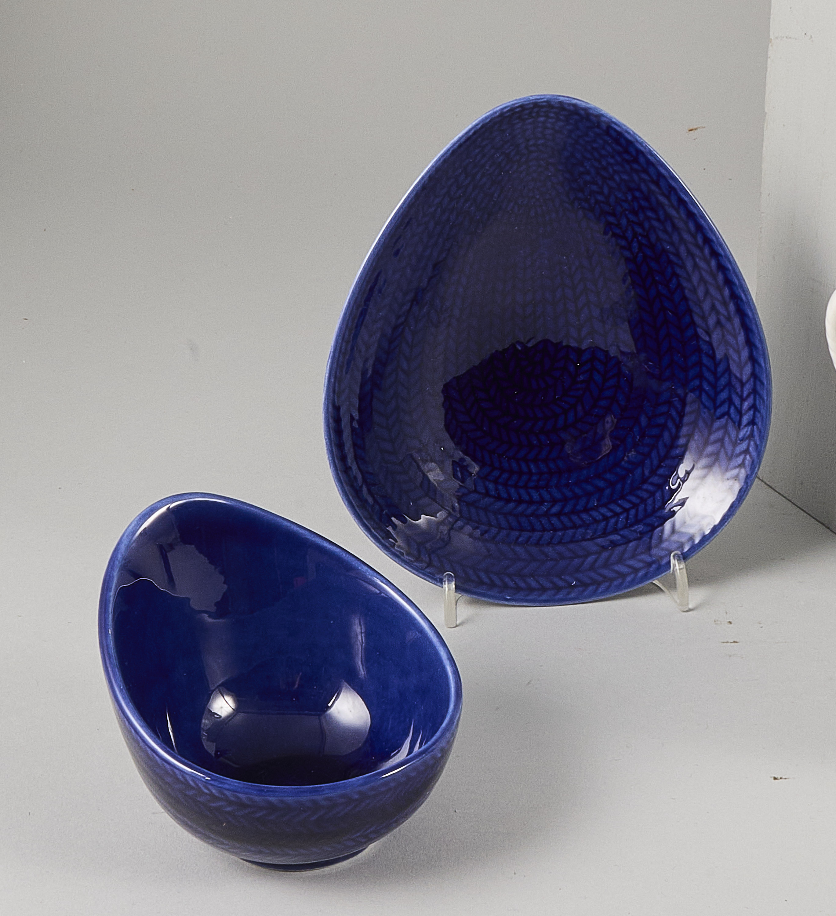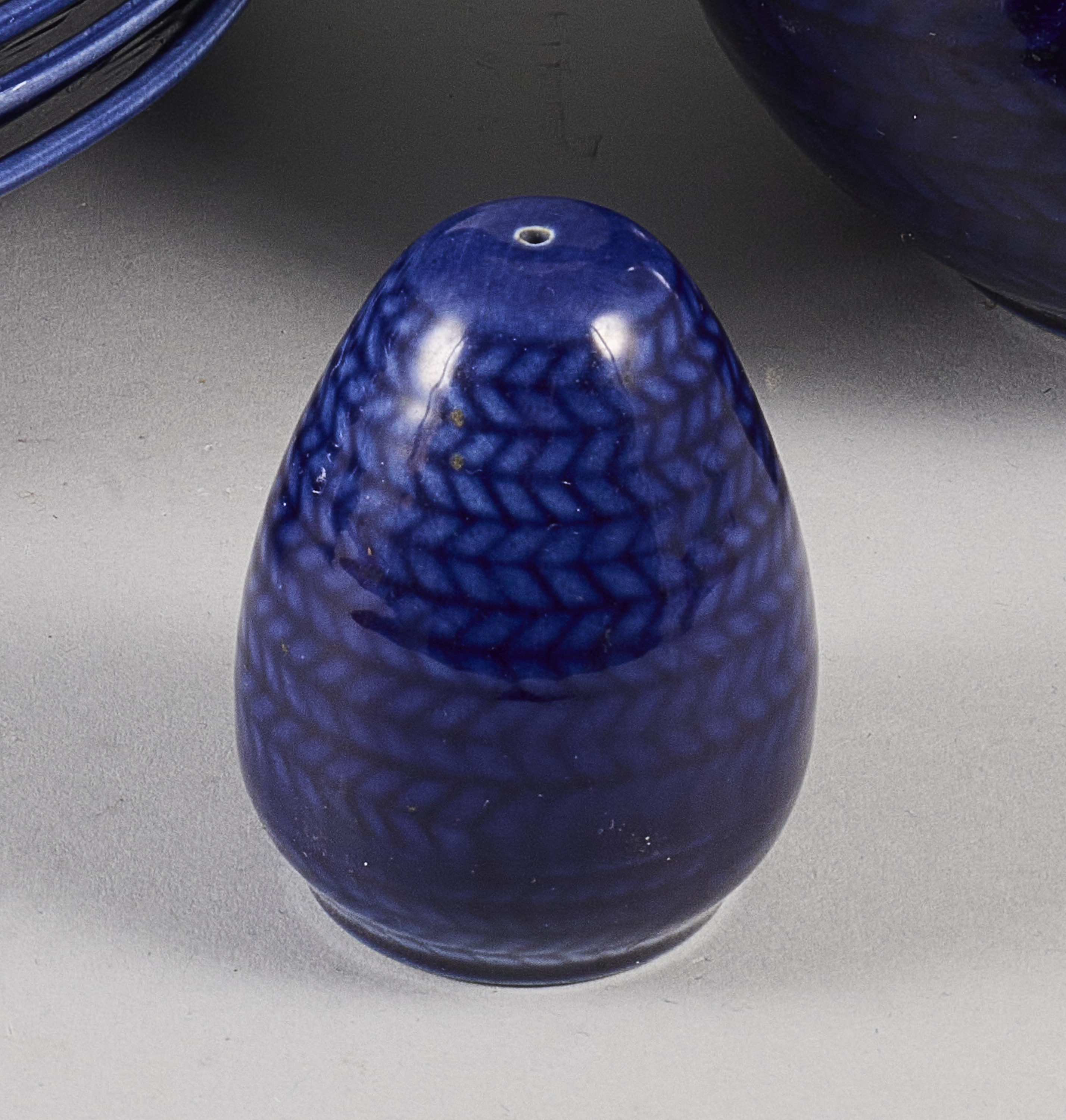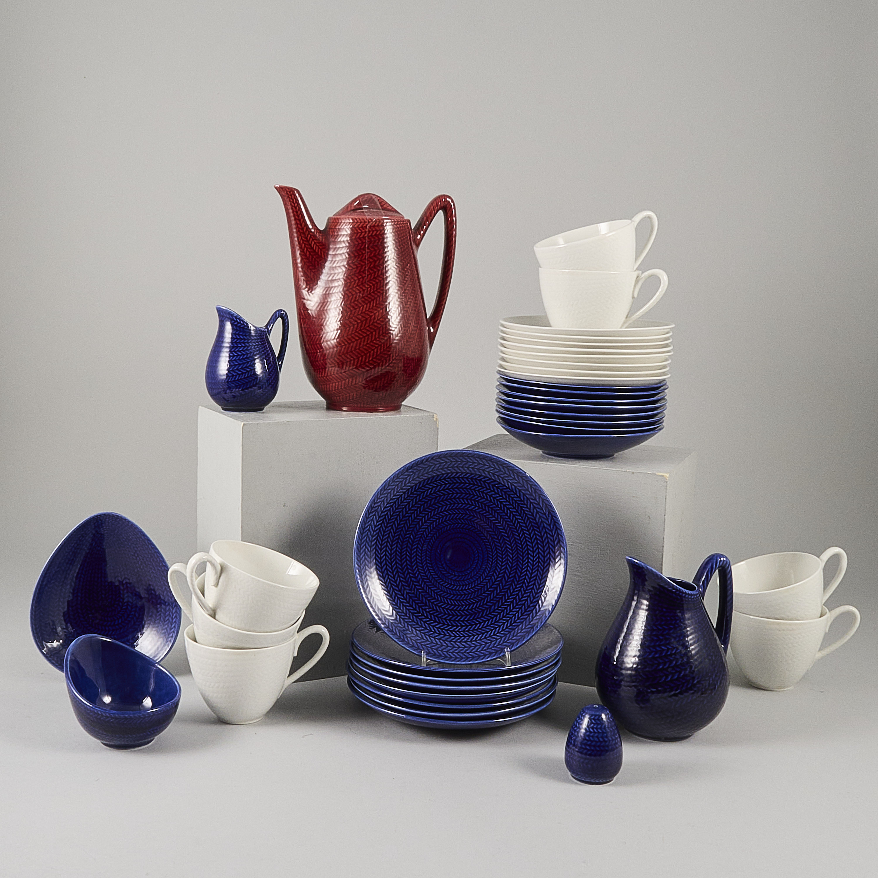 30 delar, Hertha Bengtsson "Blå Eld", Rörstrand, flintgods med blå/röd/vit reliefdekor, 7 koppar med fat. Höjd: 8 cm, + 8 extra fat, 8 assietter, kanna, mjölkkanna, gräddkanna, skål, pepparkar, mindre fat