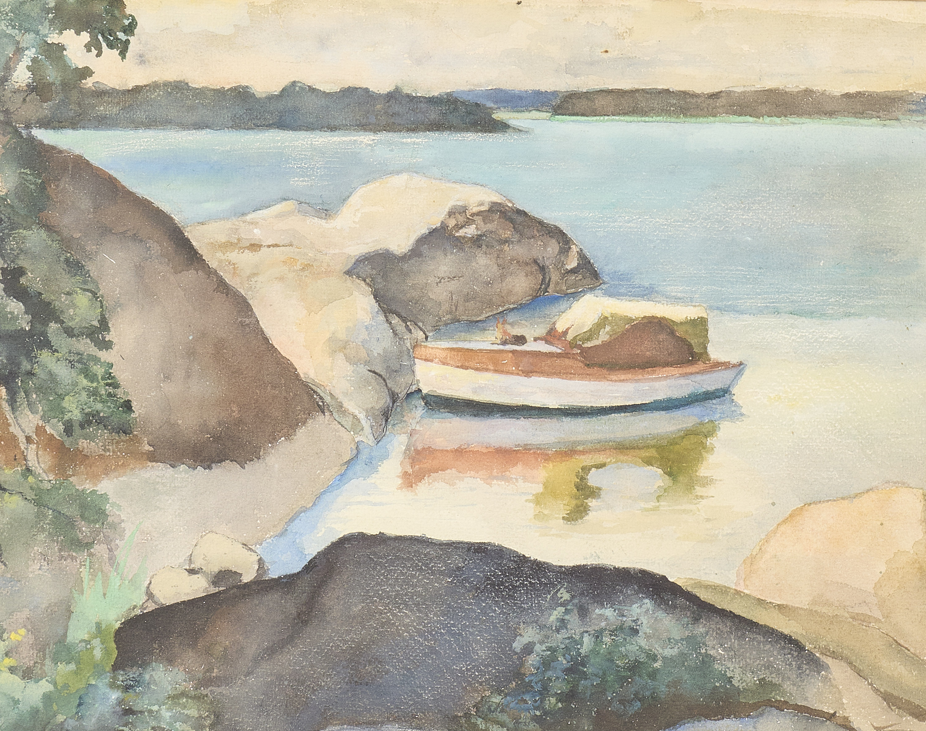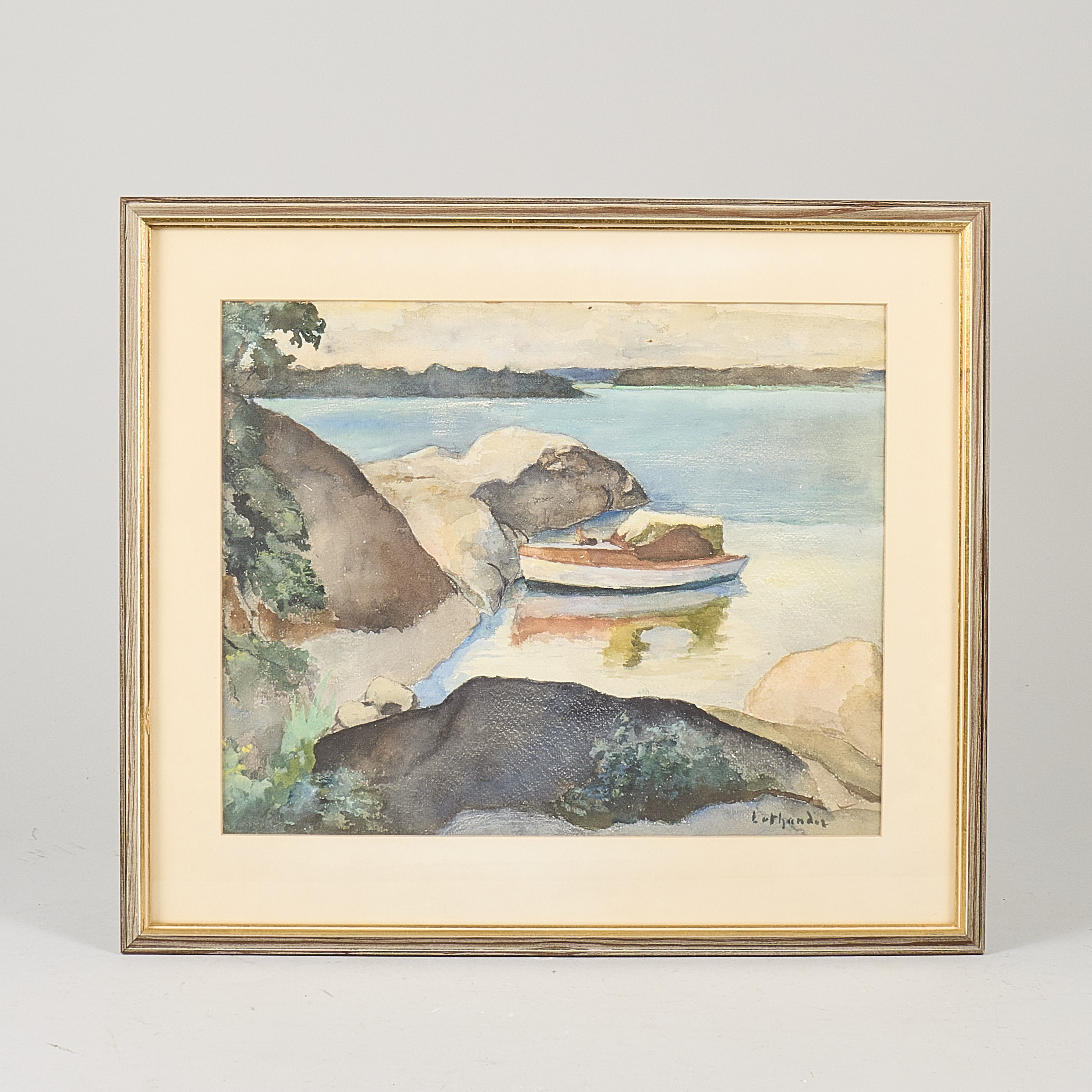 Carl Luthander (1879-1967), Sverige. Signerad, skärgård med träbåt, 28x35 cm, yttermått inklusive ram: 40x47 cm