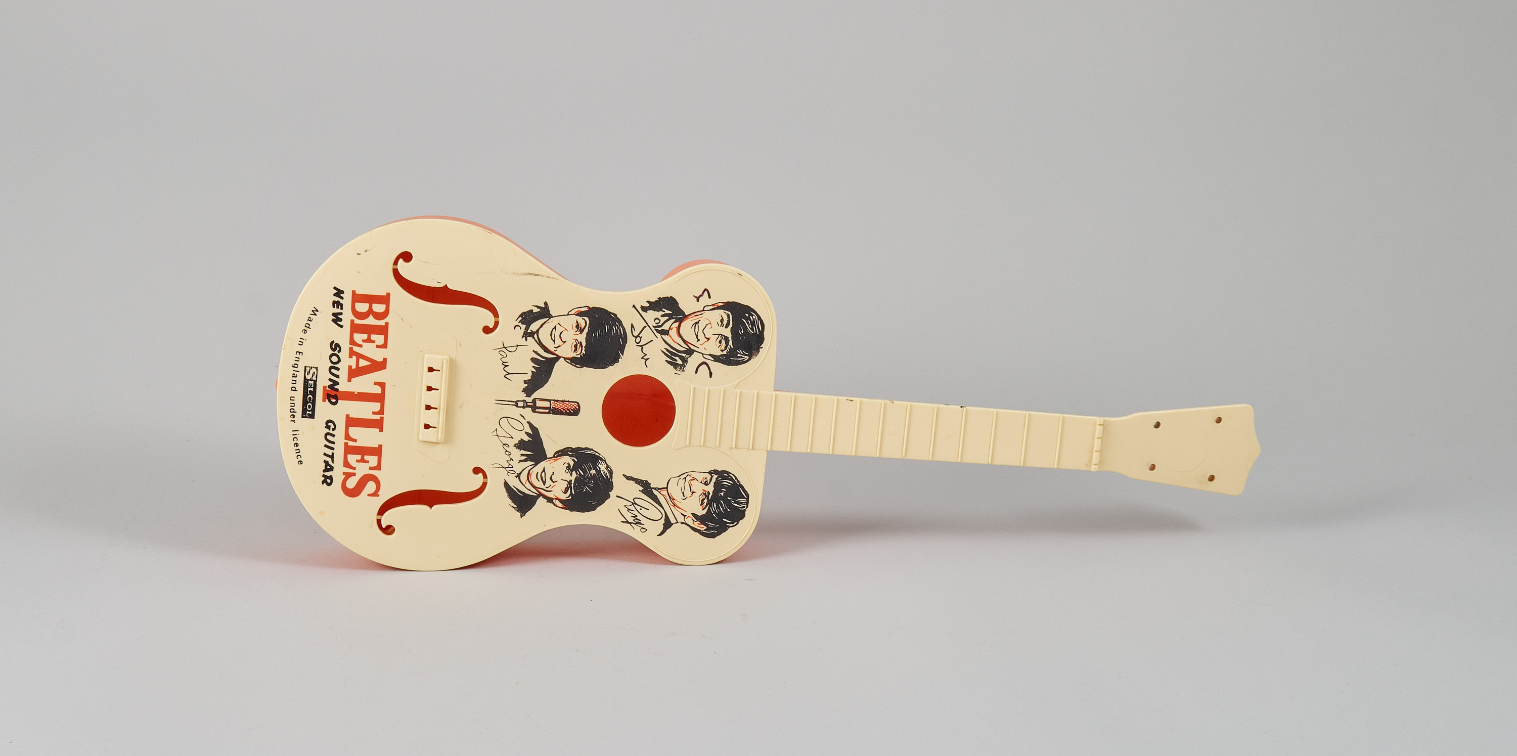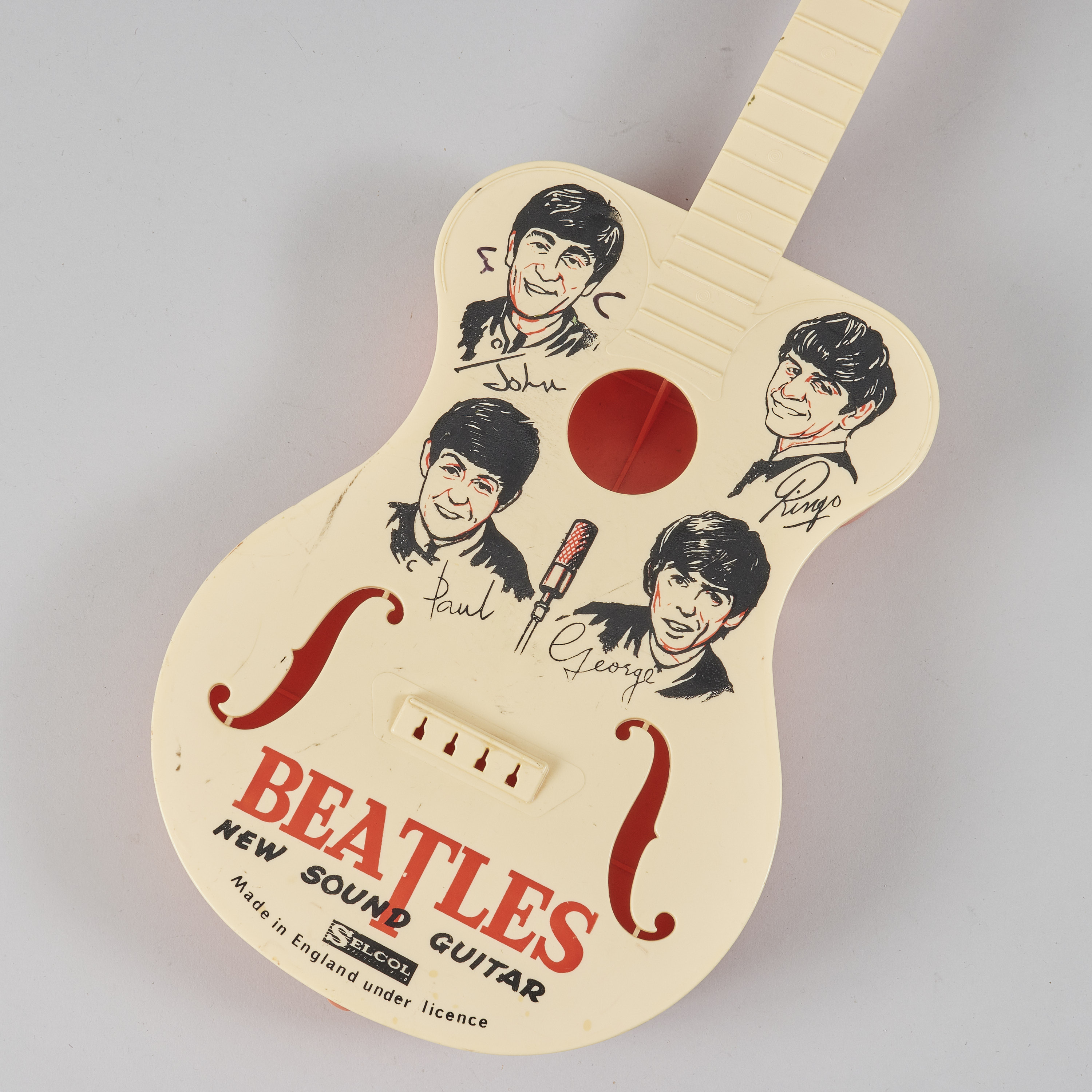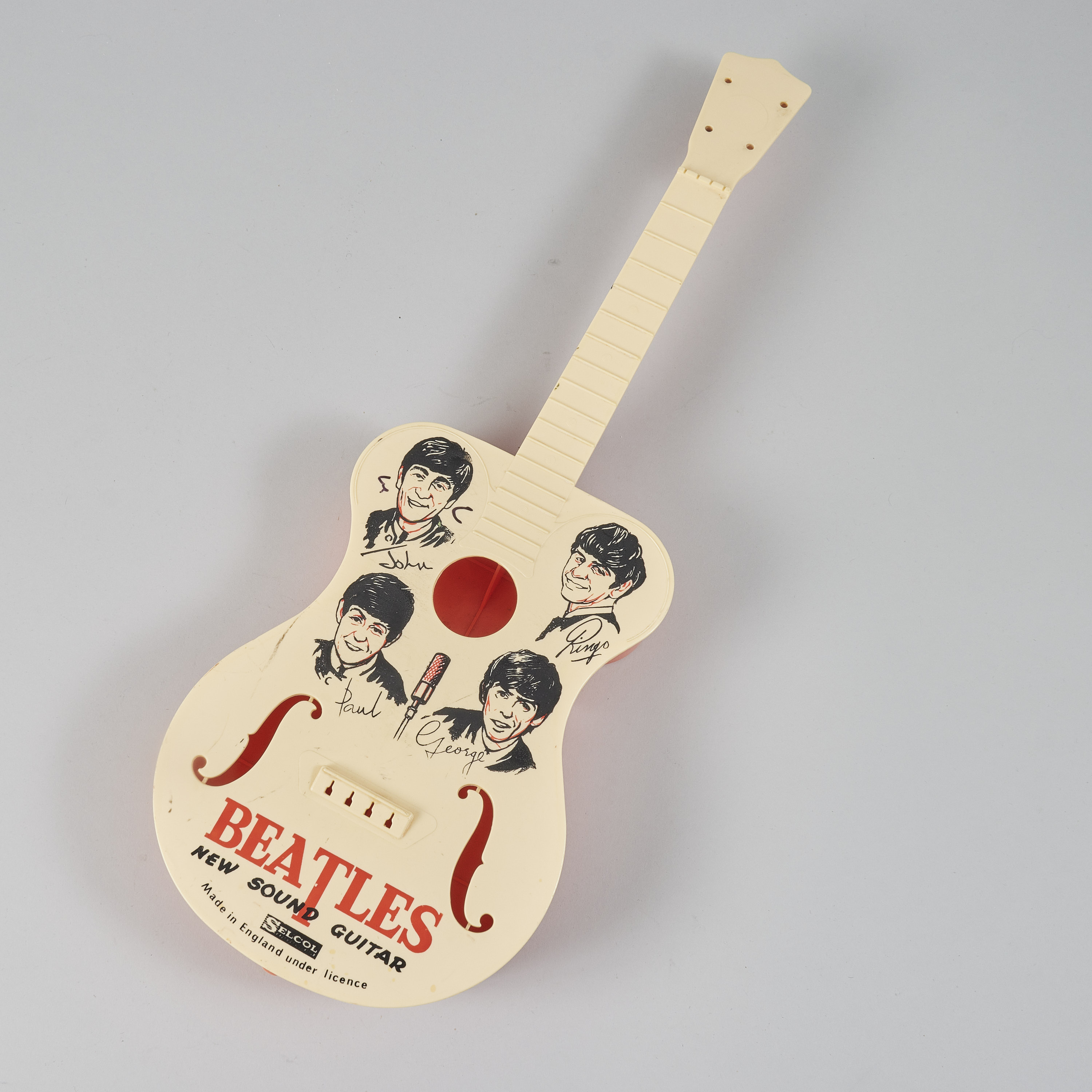 "Beatles New sound Guitar", Selcol, plast. Längd: 58 cm, sakar delar, slitage