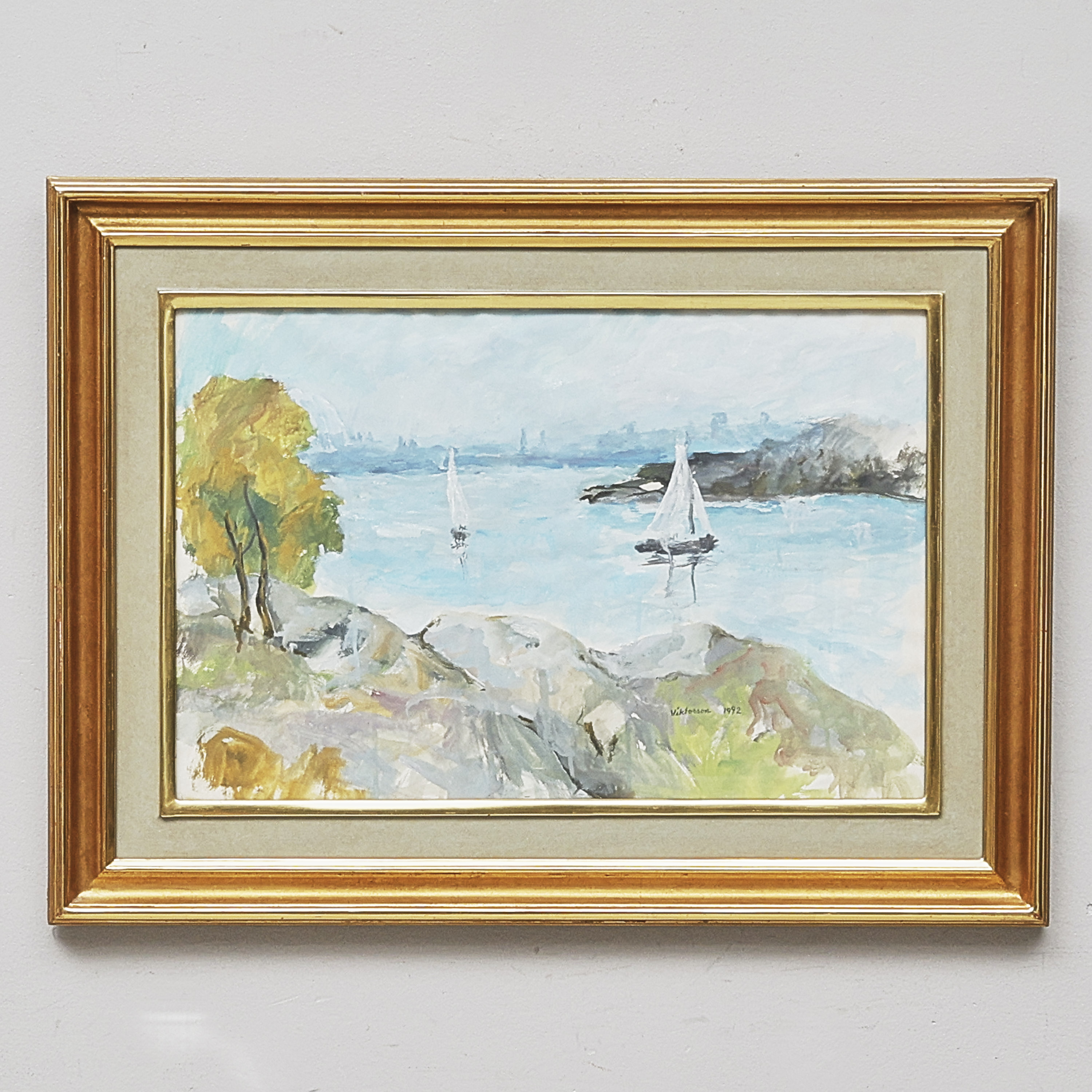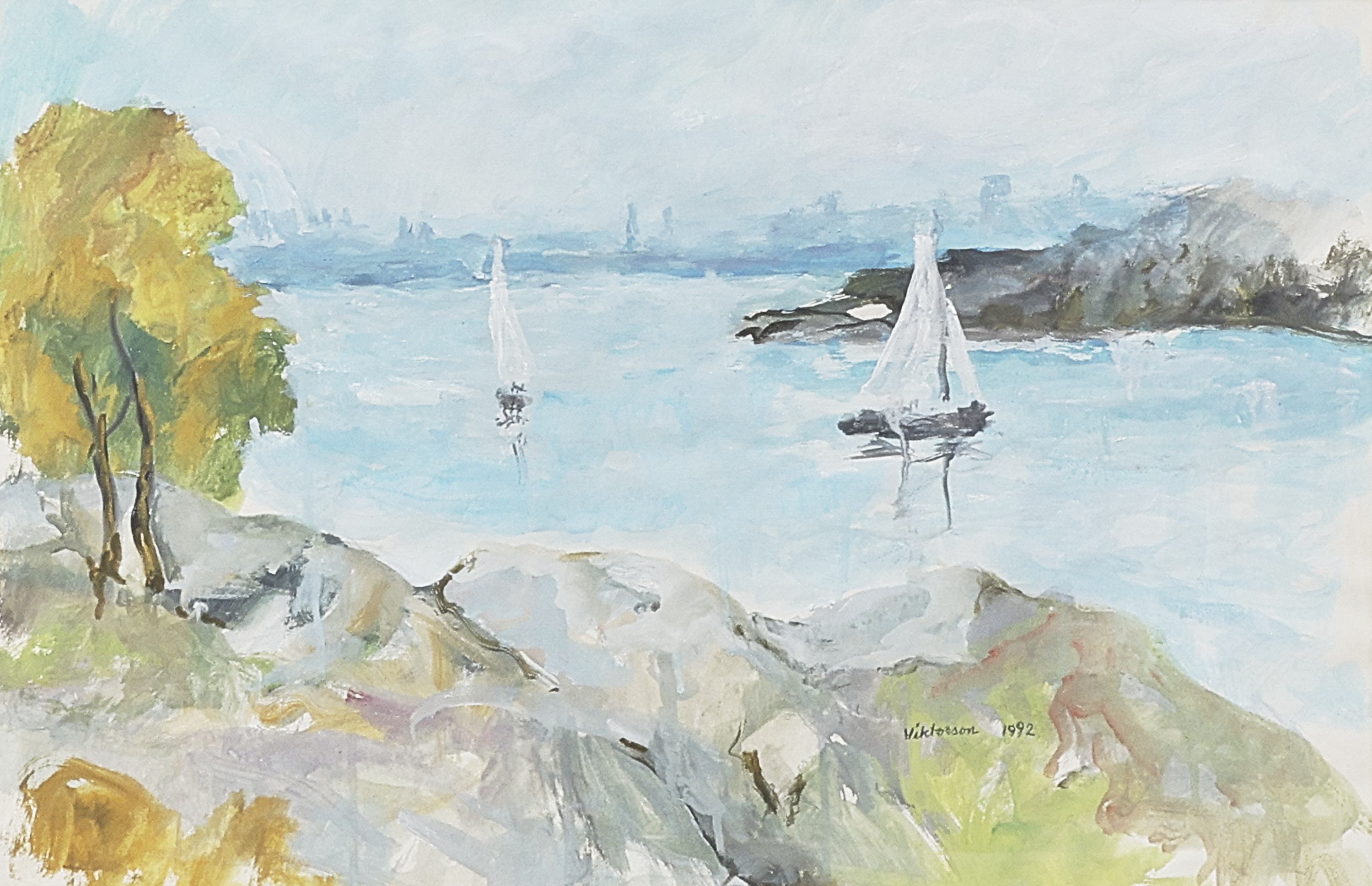 Erik Viktorson (f. 1912), Sverige. Signerad, daterad -92, segelbåtar i skärgård. Akvarell, bildmått: 38x58 cm, yttermått inklusive ram: 58x78 cm