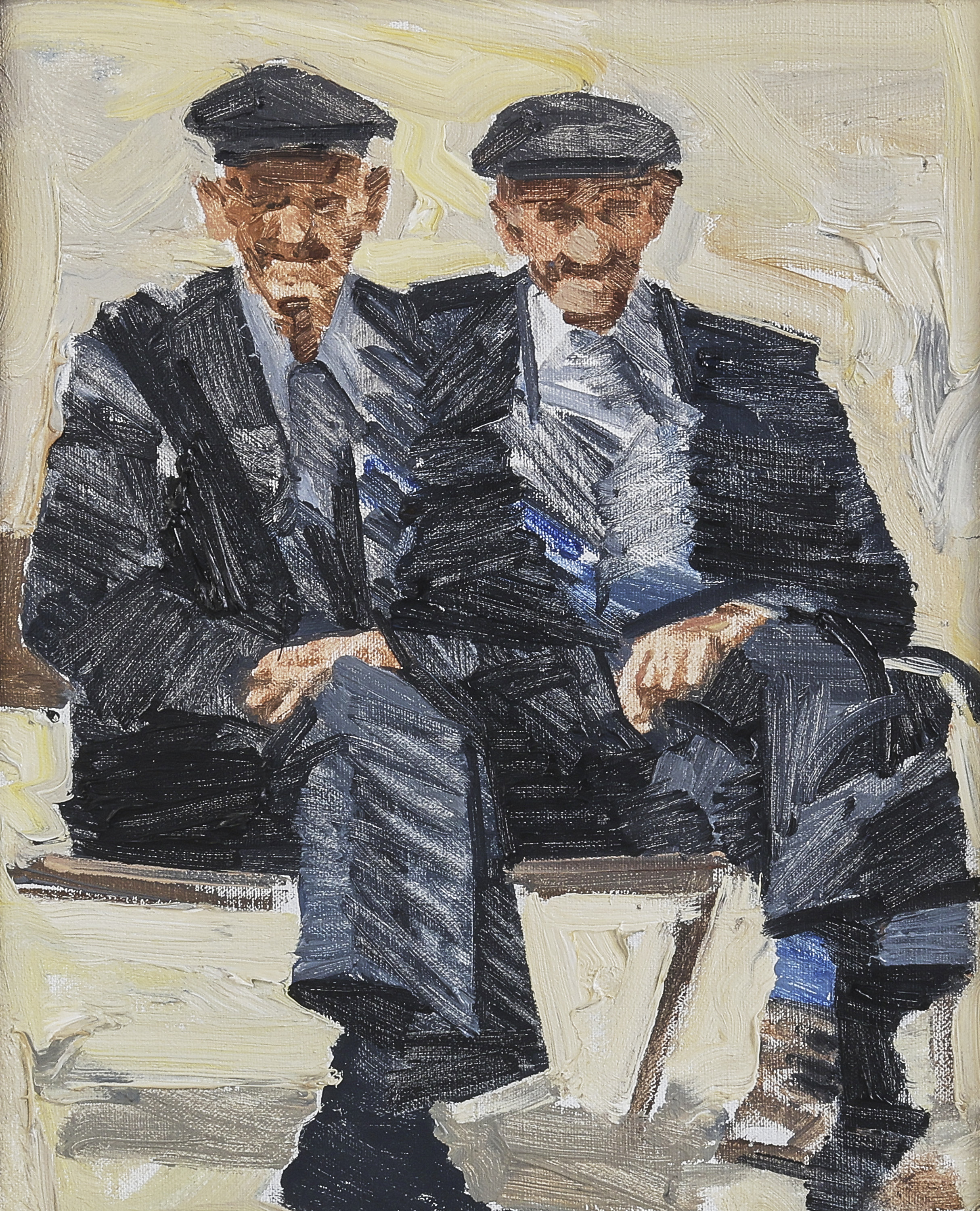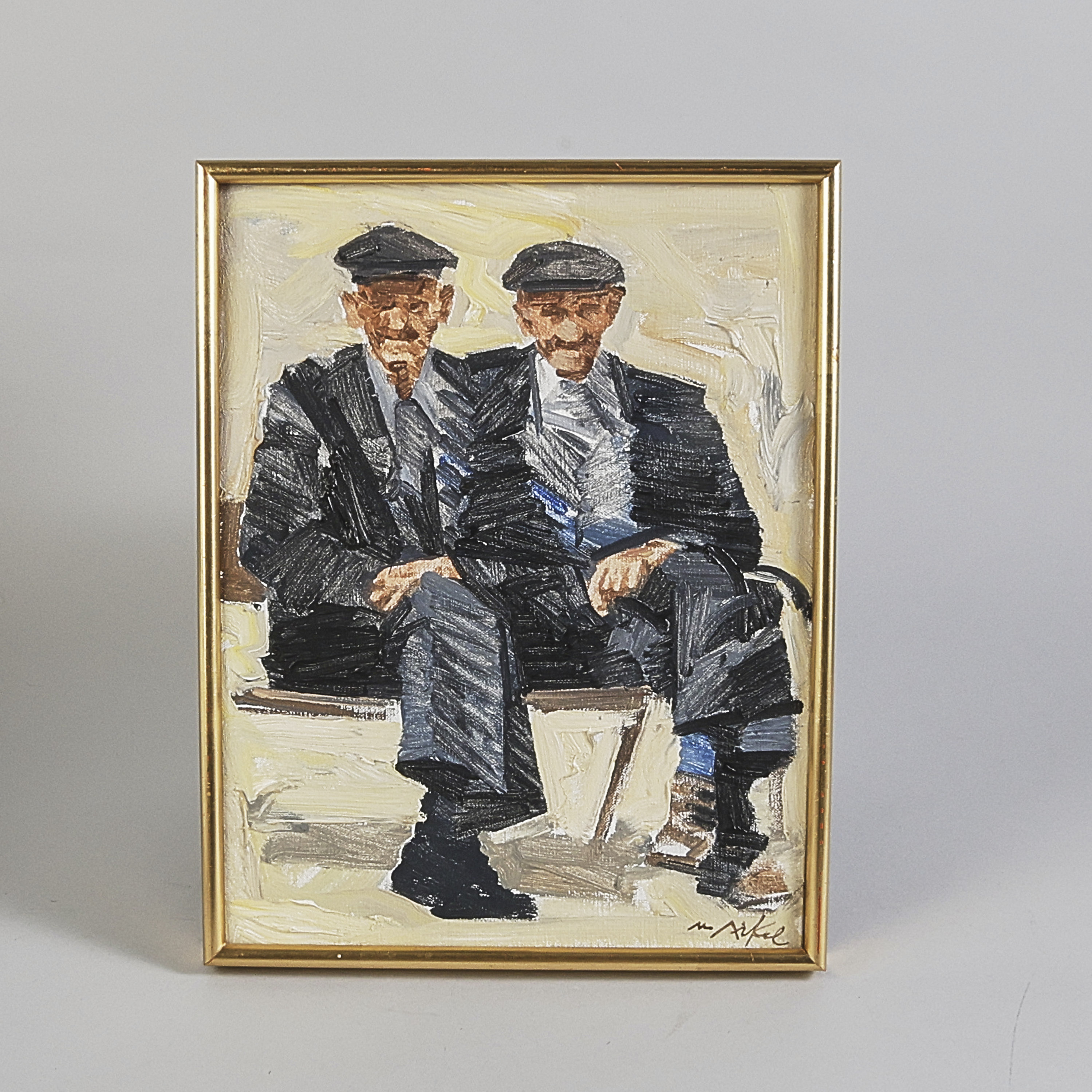Adrian van Arkel (1924-2006), Sverige. Gubbar på bänk. Signerad. Olja på duk, 34x26 cm, yttermått inklusive ram: 37x29