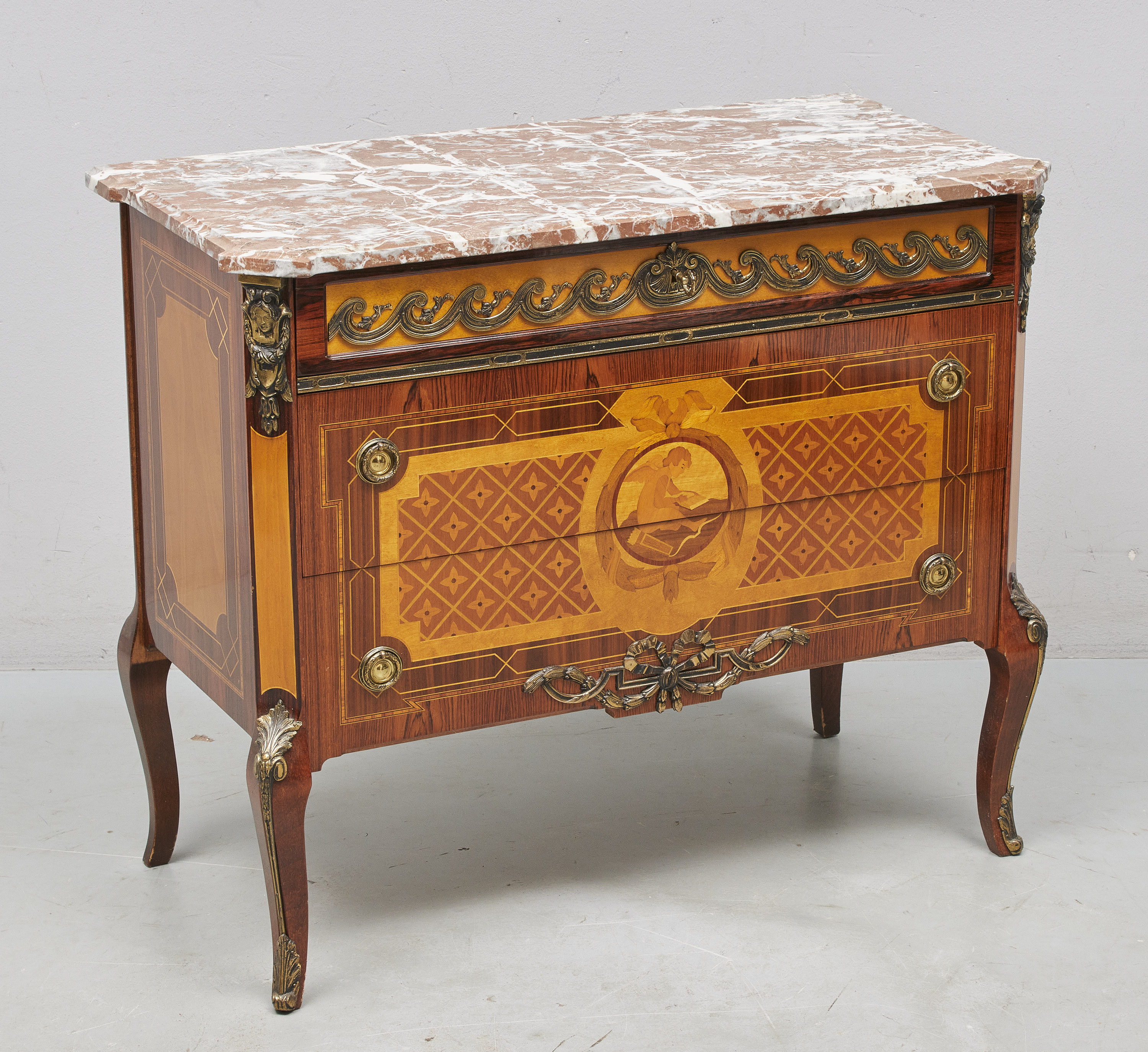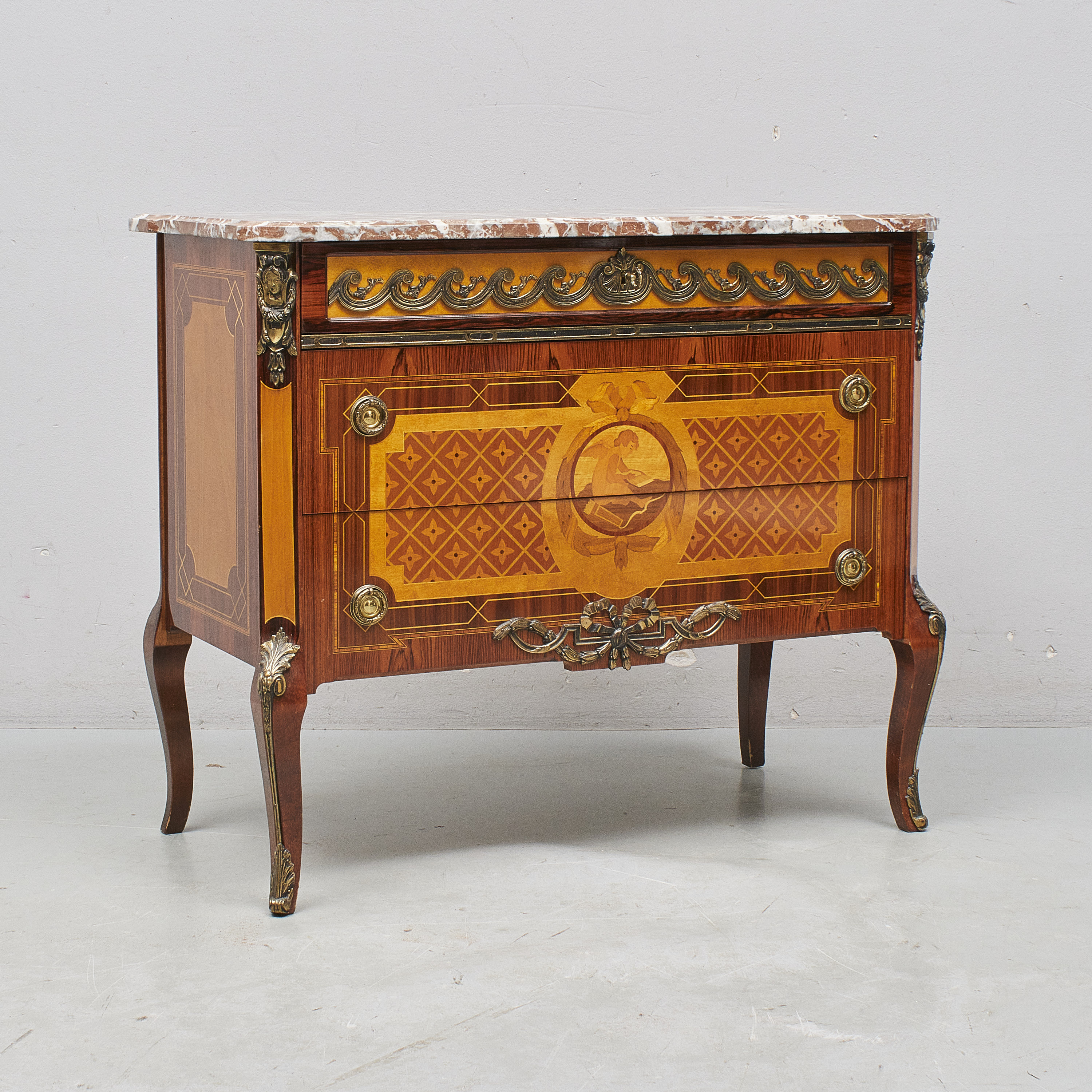 Gustaviansk stil, intarsia, Stenskiva. Bredd: 86, djup: 40 cm, höjd: 72 cm, nyckel