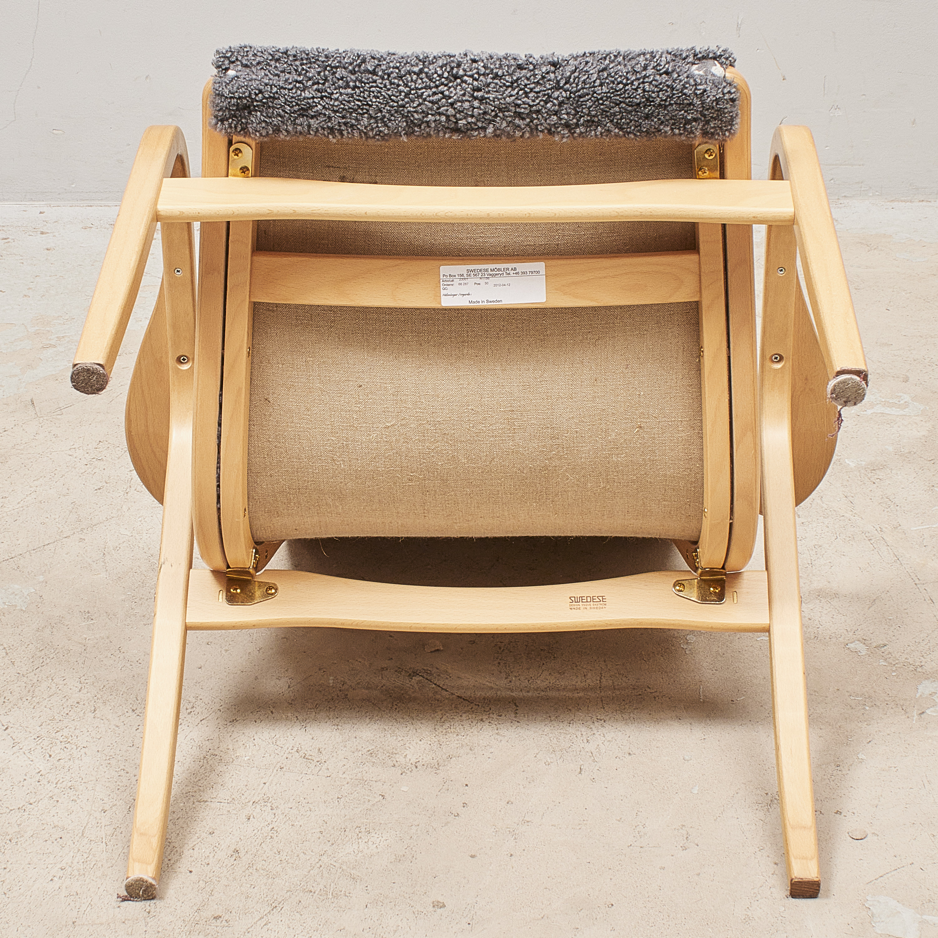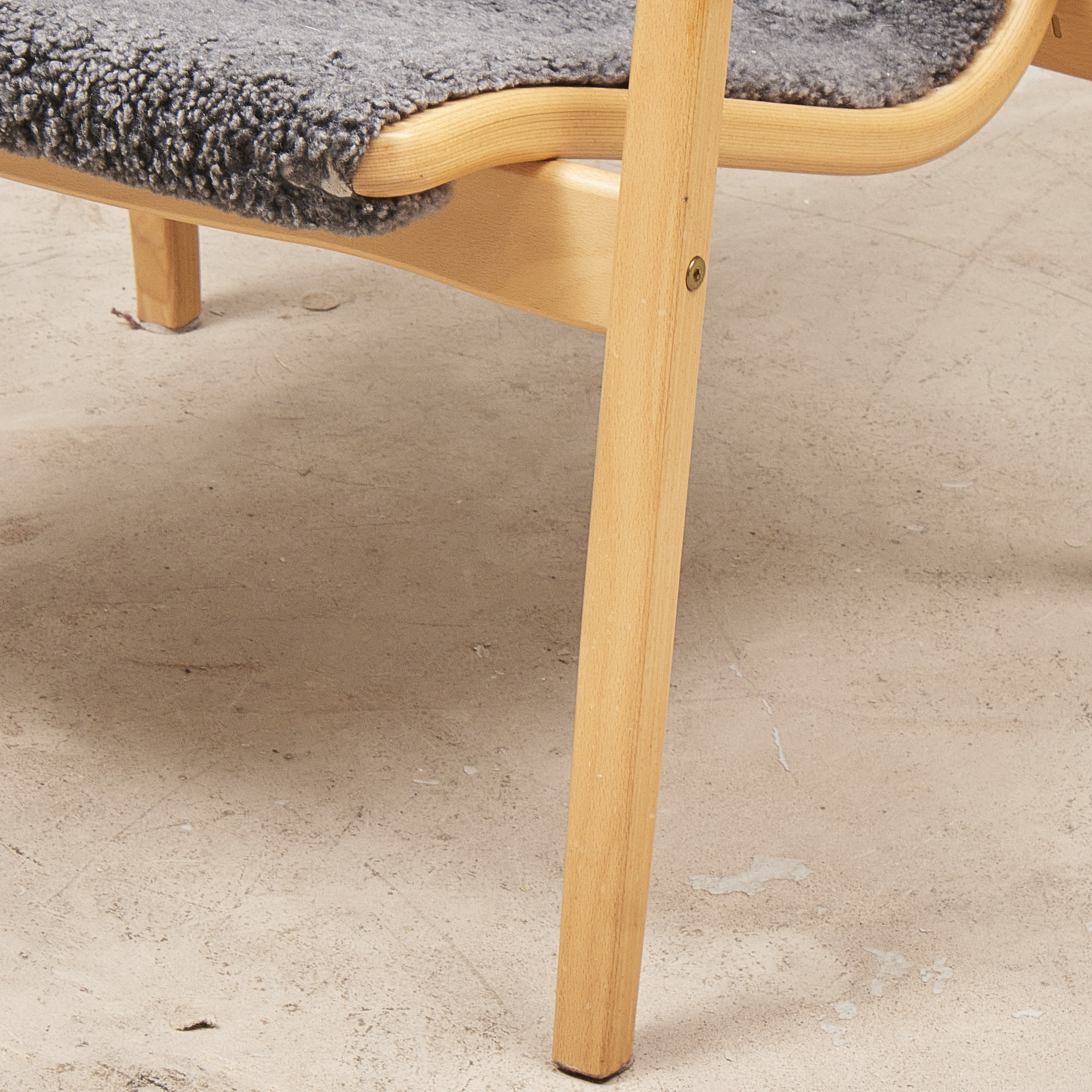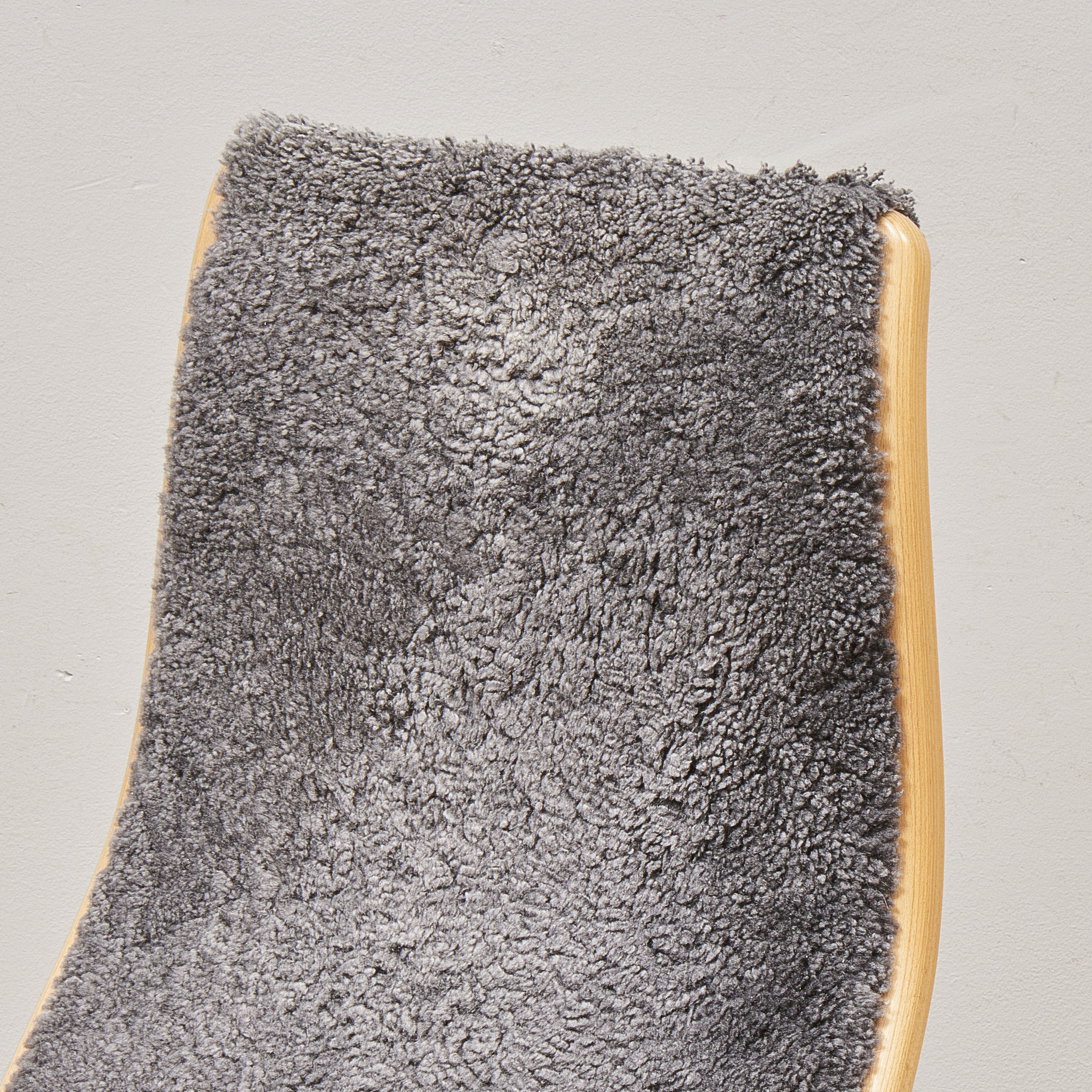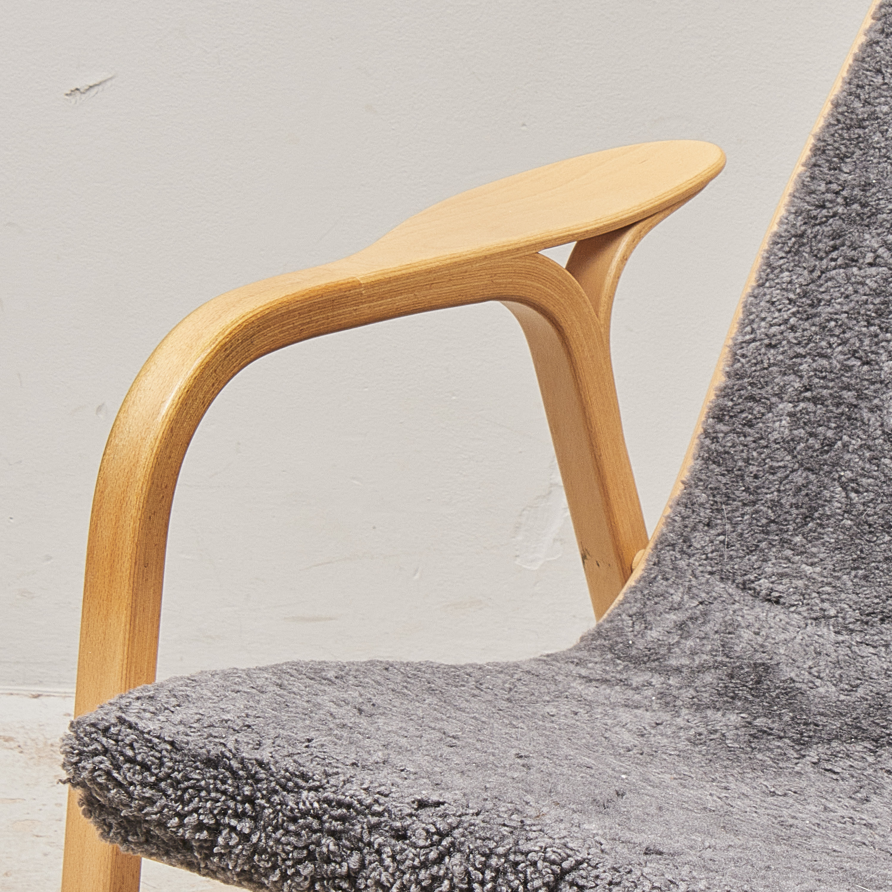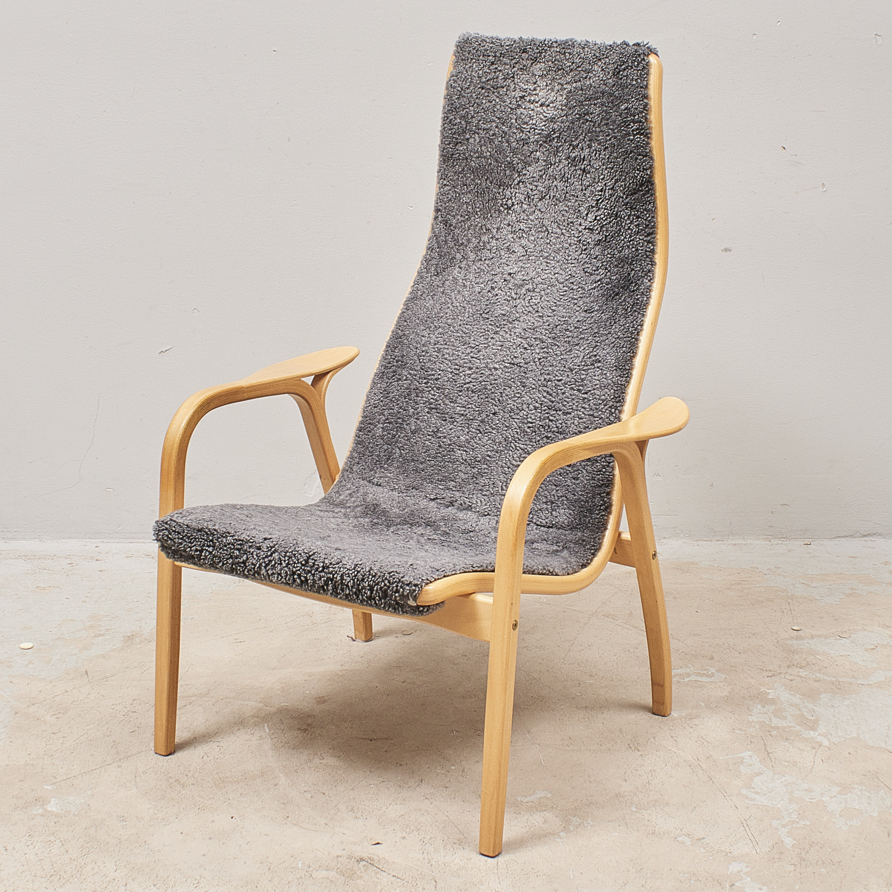 Yngve Ekström (1913-1988), Sverige, Lamino, Swedese, Skiktlimmat och formpressat trä, fårskinn i grått, brännstämplad Swedese. Bredd: 70 cm. Höjd: 101 cm, sitthöjd