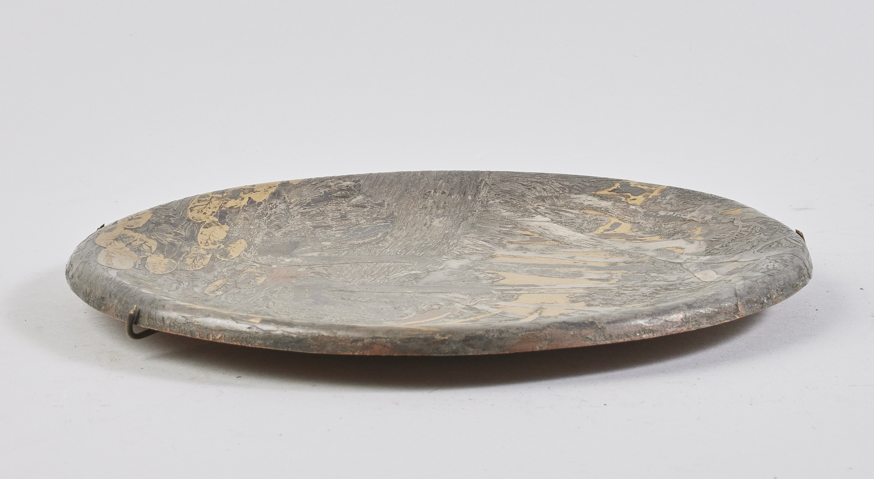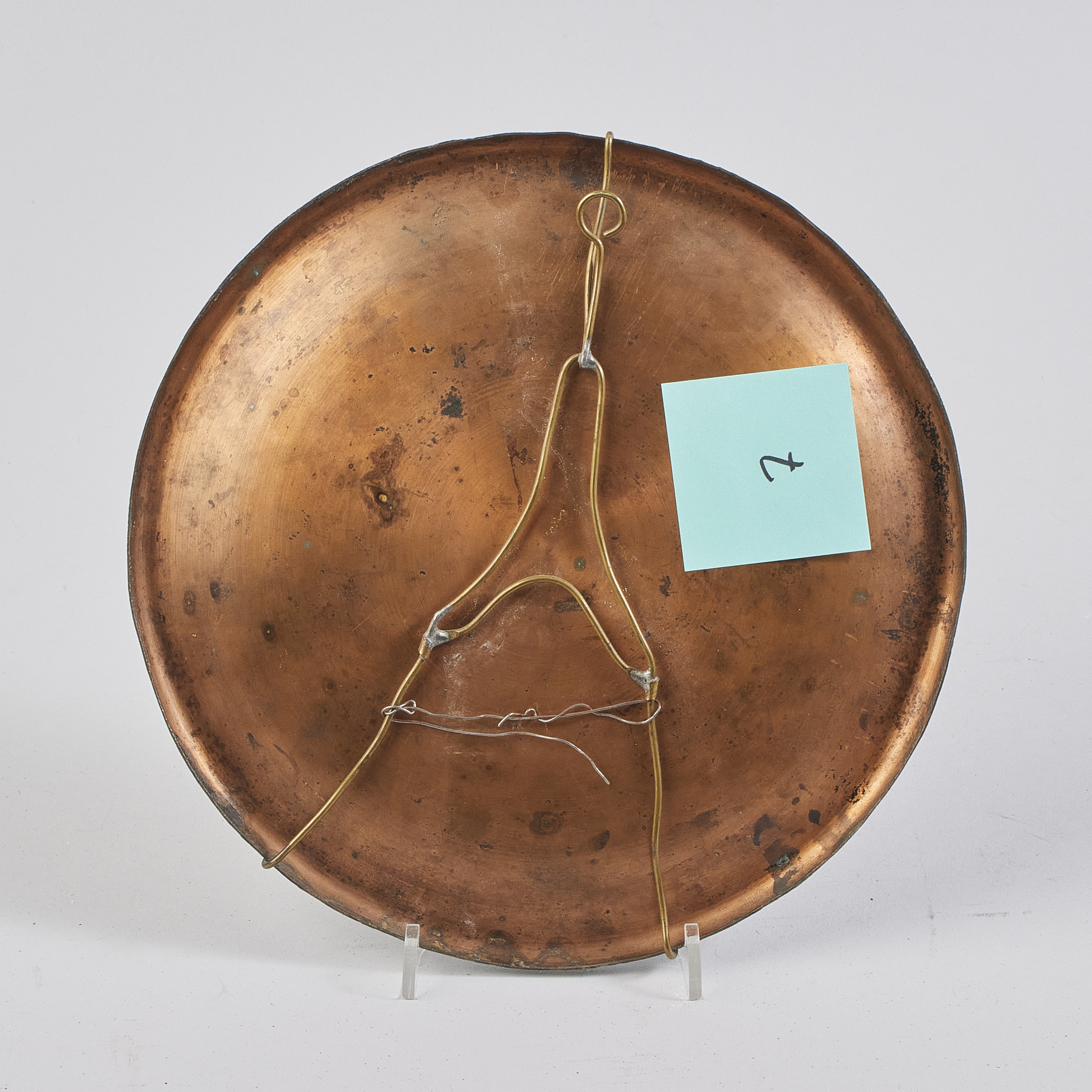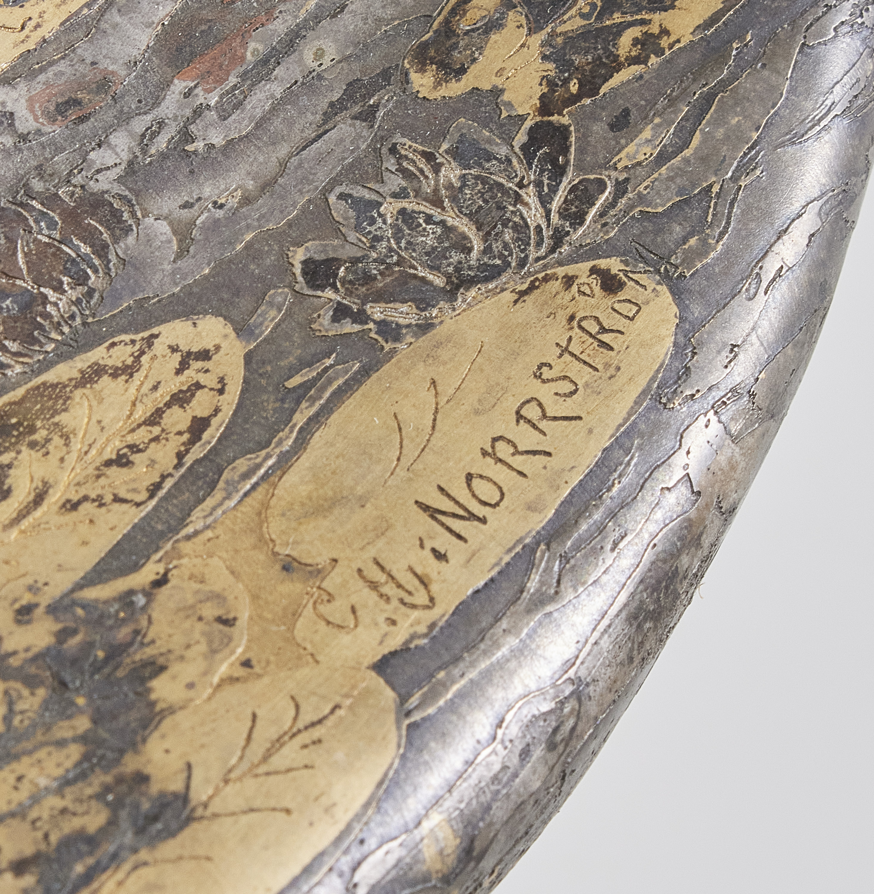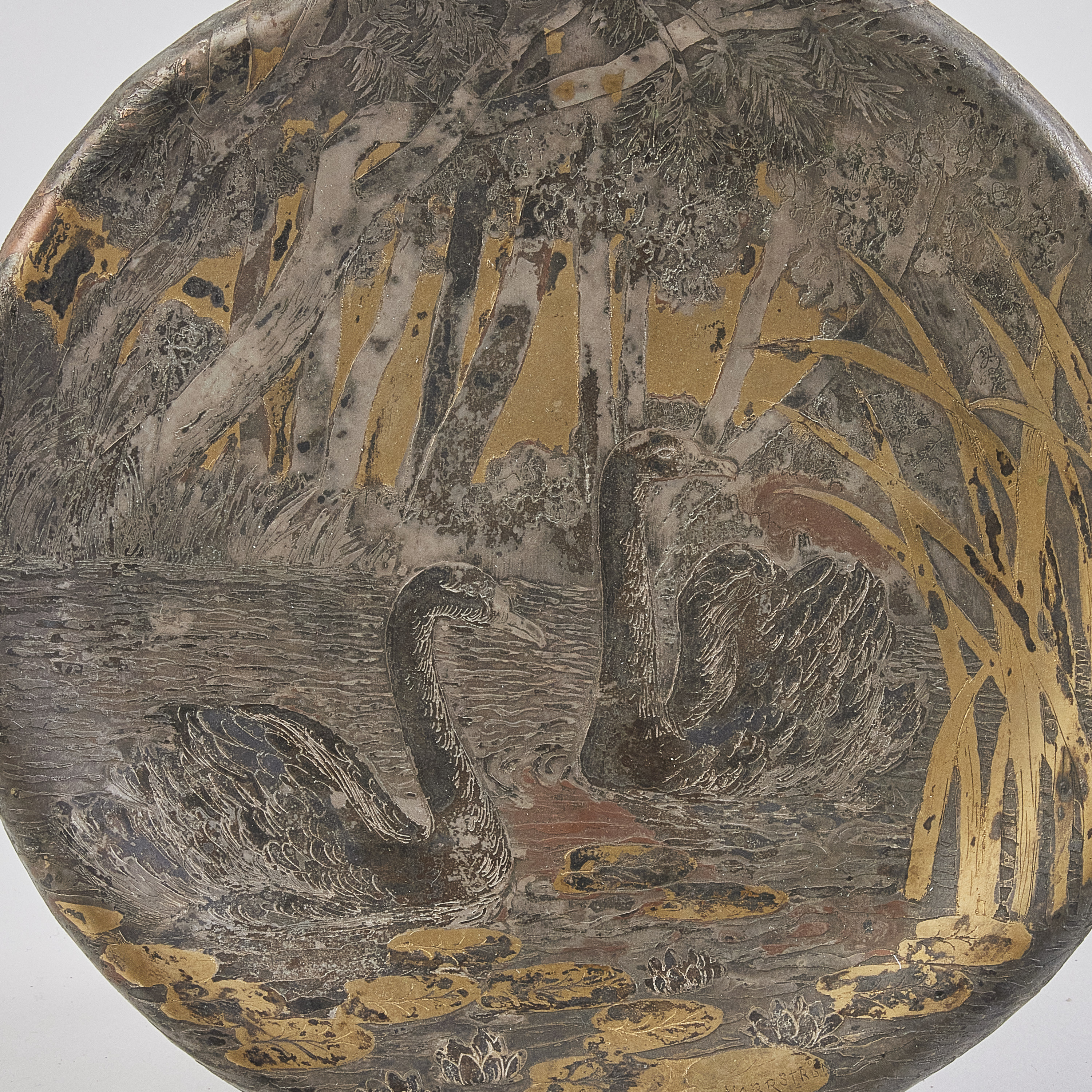 Hjalmar Norrström (1853-1924), Sverige. Fat med ståletsning. Motiv med två svanar. Signerad. Diameter: 22,5 cm. Hjalmar Norrström bodde på Ängsvägen 21 i Storängen