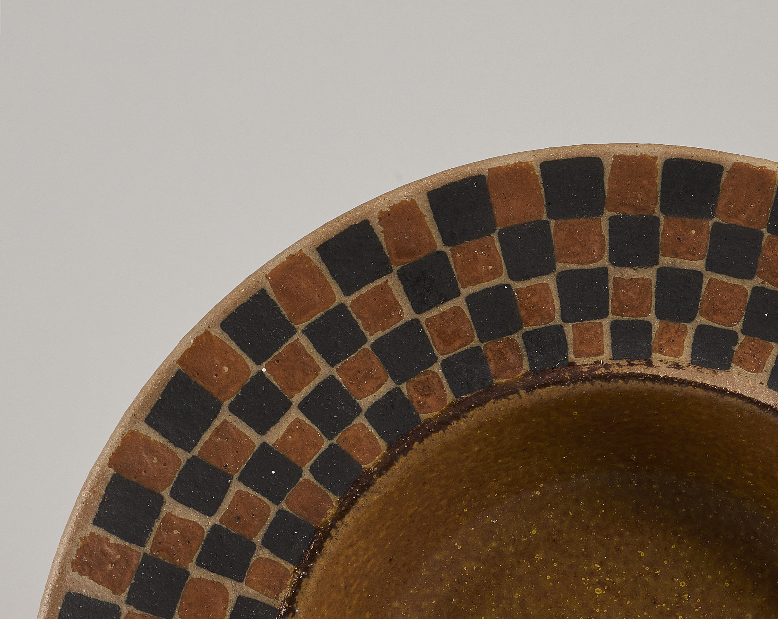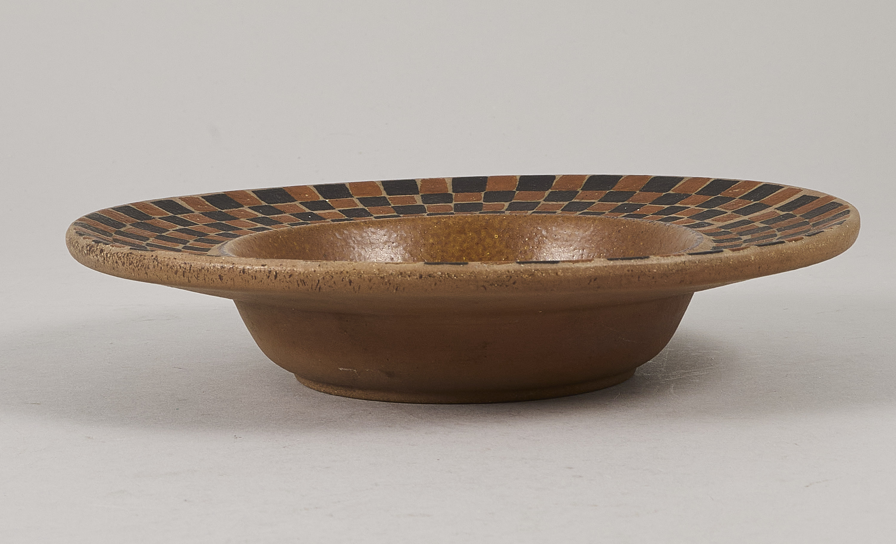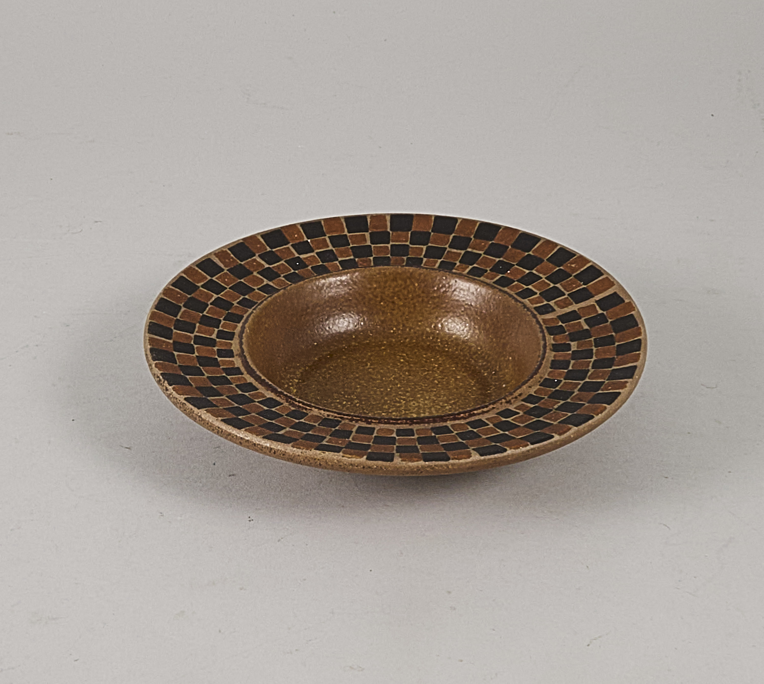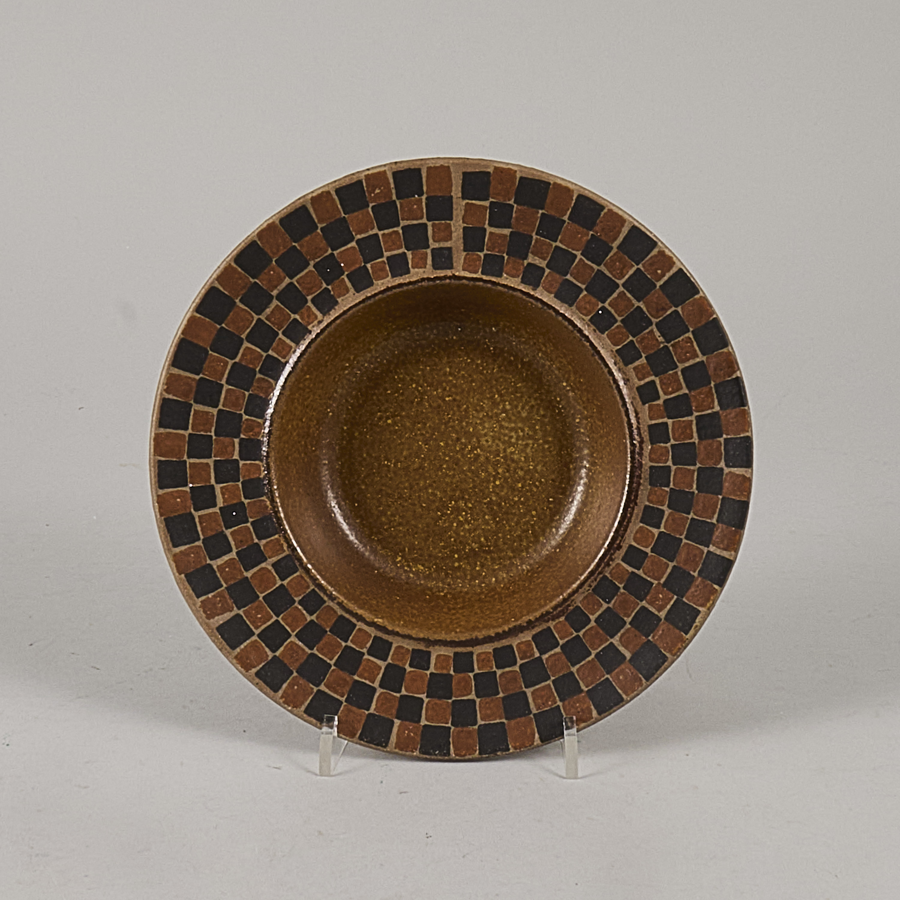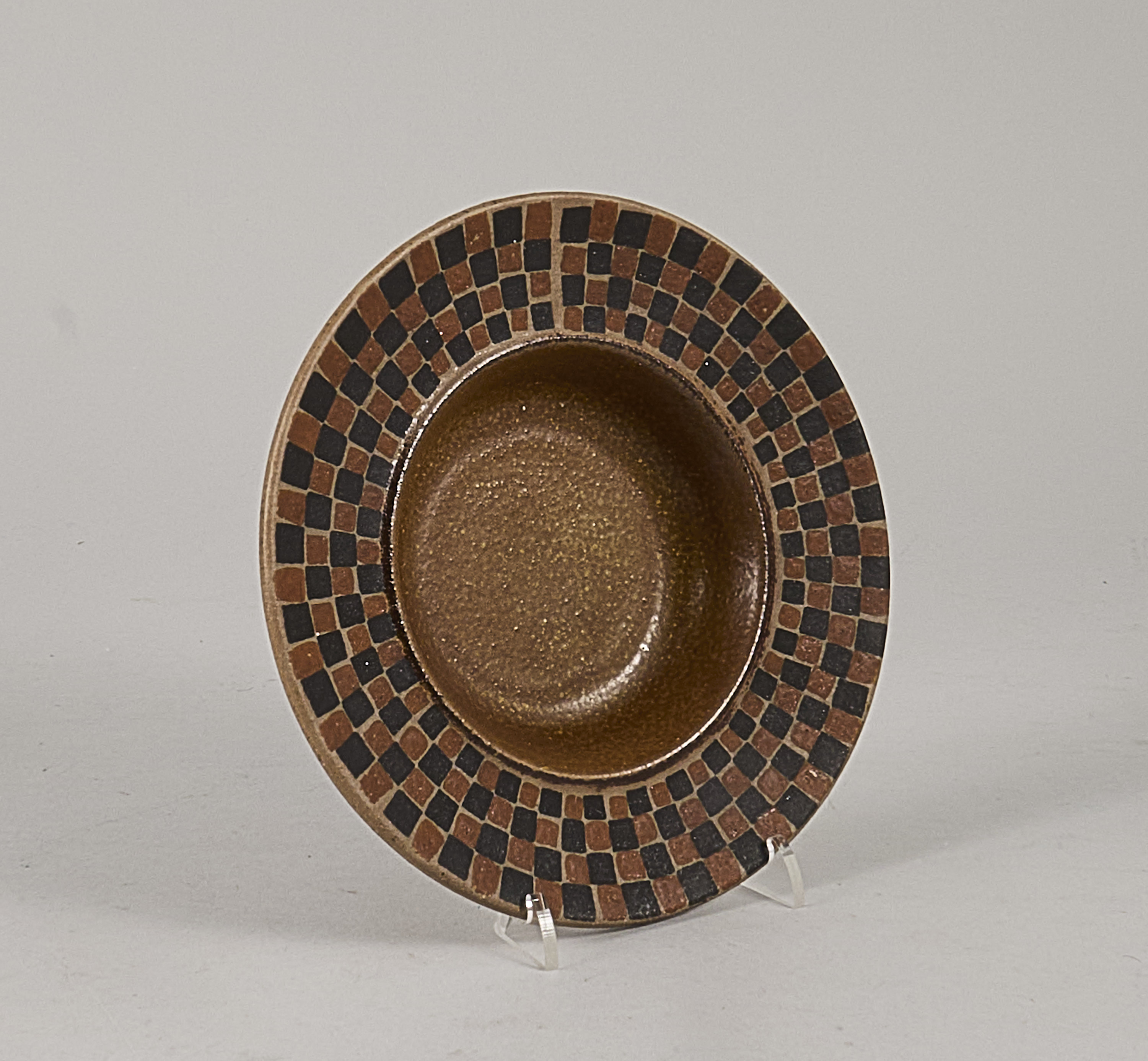 Stig Lindberg (1916-1982), Sverige. Silur, Gustavsberg, 1960-tal, chamotterat stengods i brunt och svart. Diameter: 19 cm