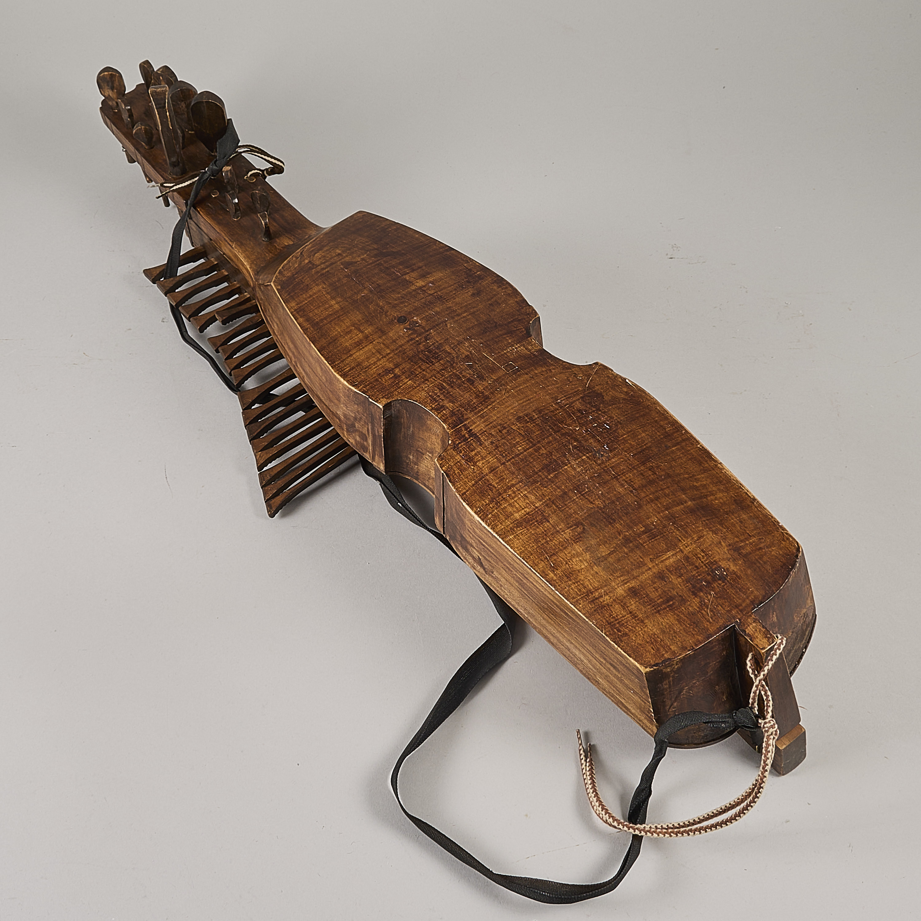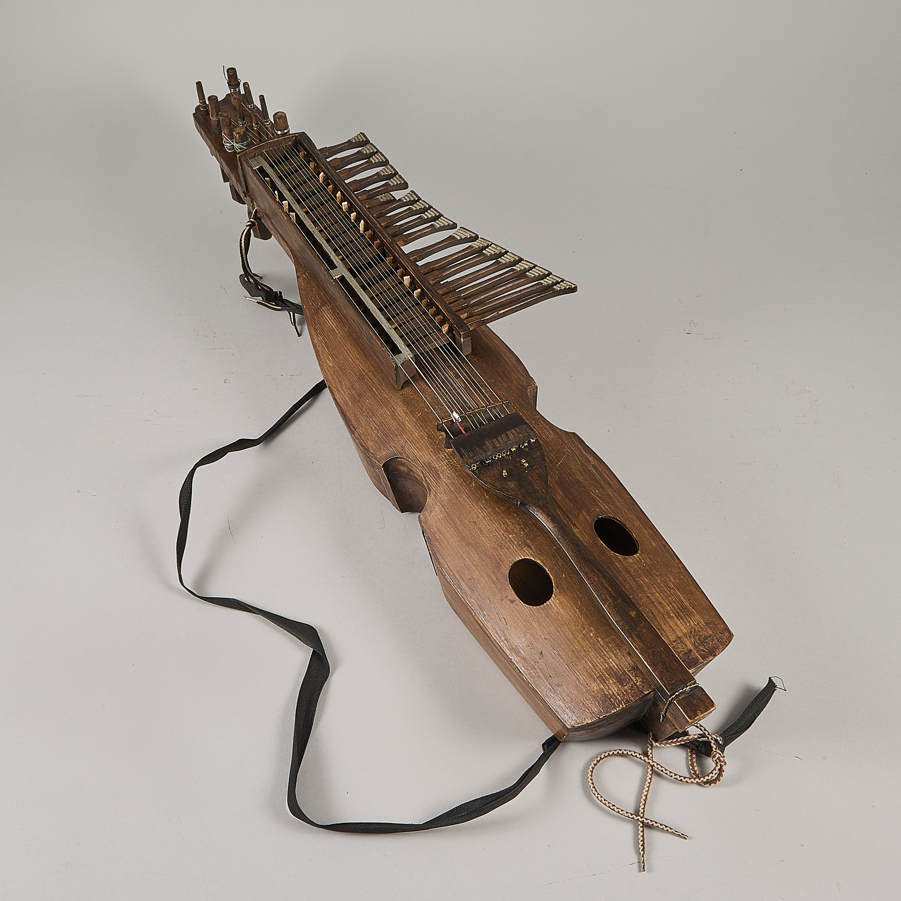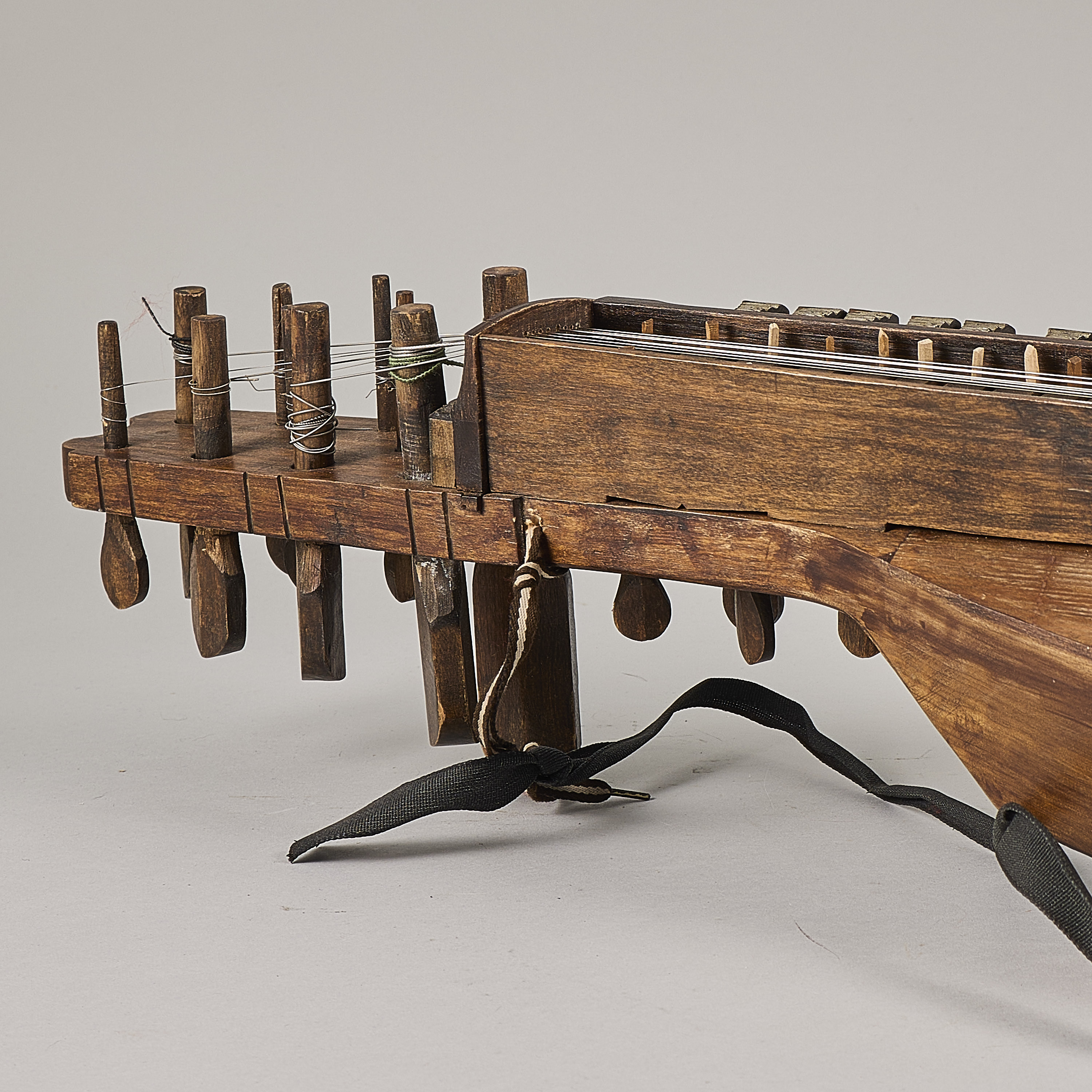 Kontrabasharpa, Jonas Spets (1841-1918), Morkarla, med väska. Längd: 87 cm, (öppen limfog), stränghållare limmad, förstärkning på insida av lock