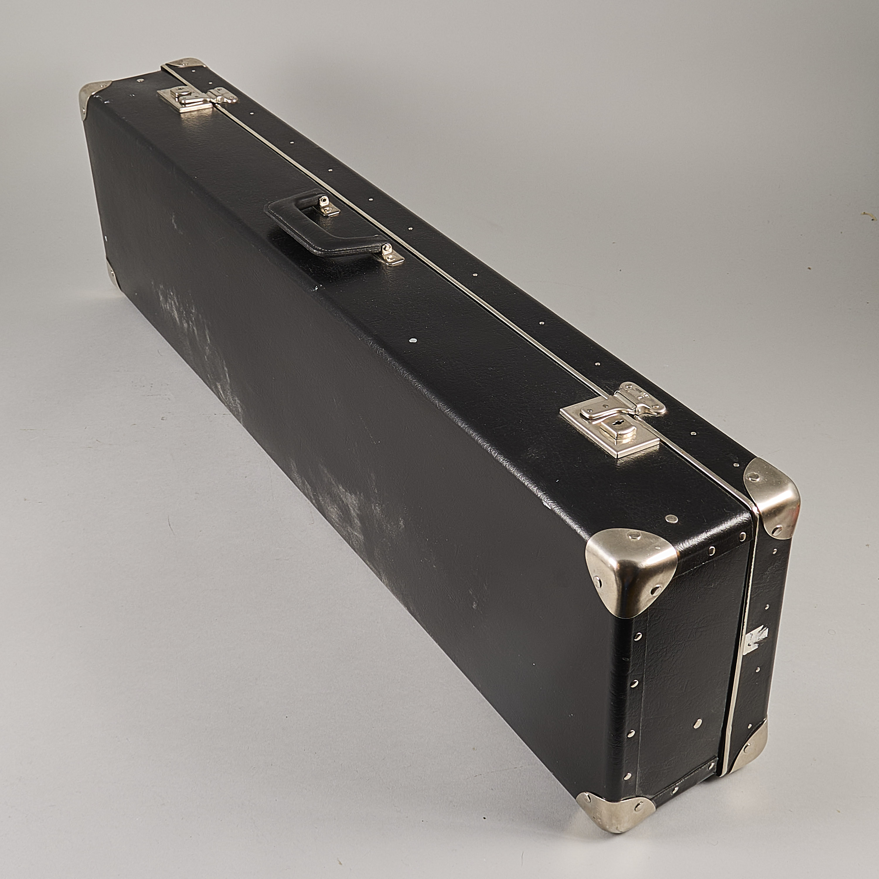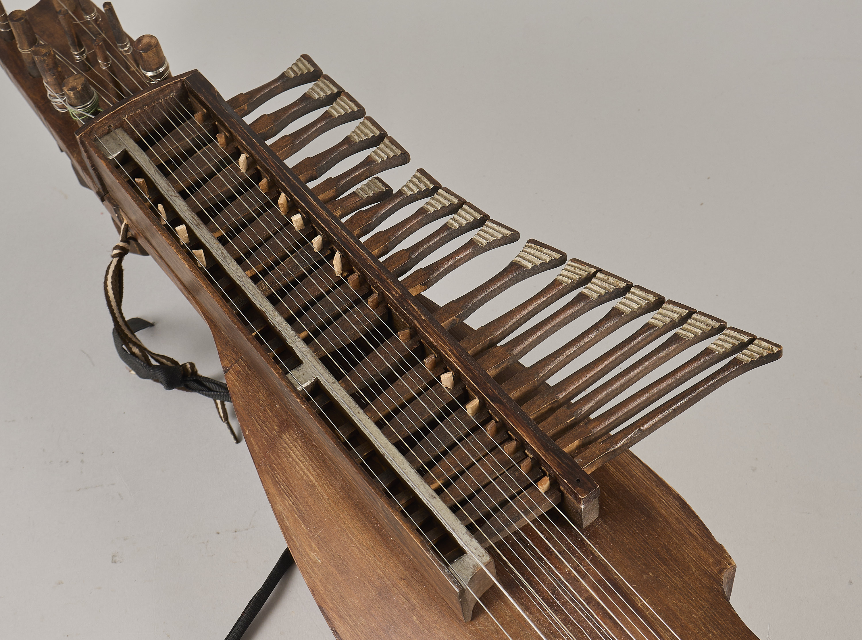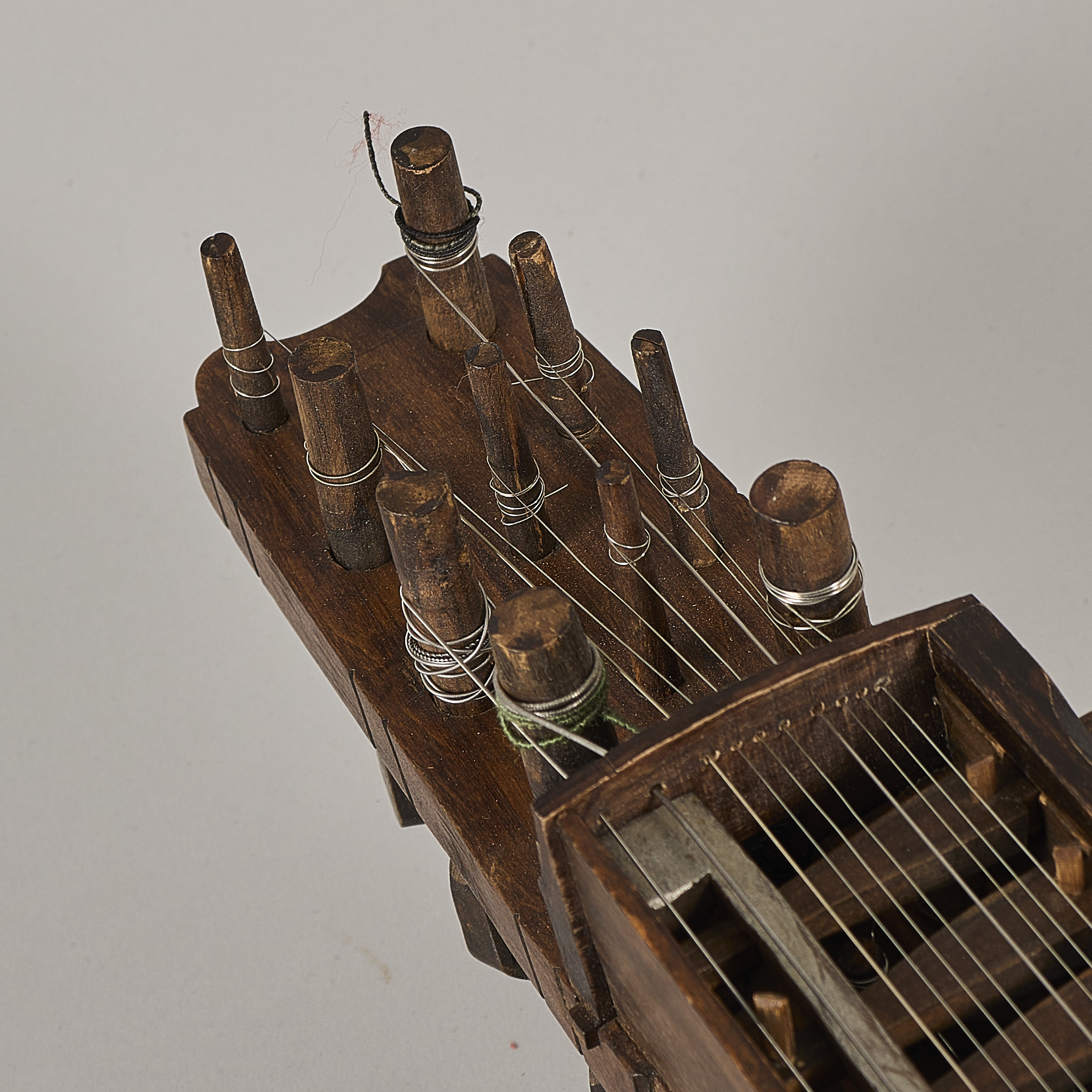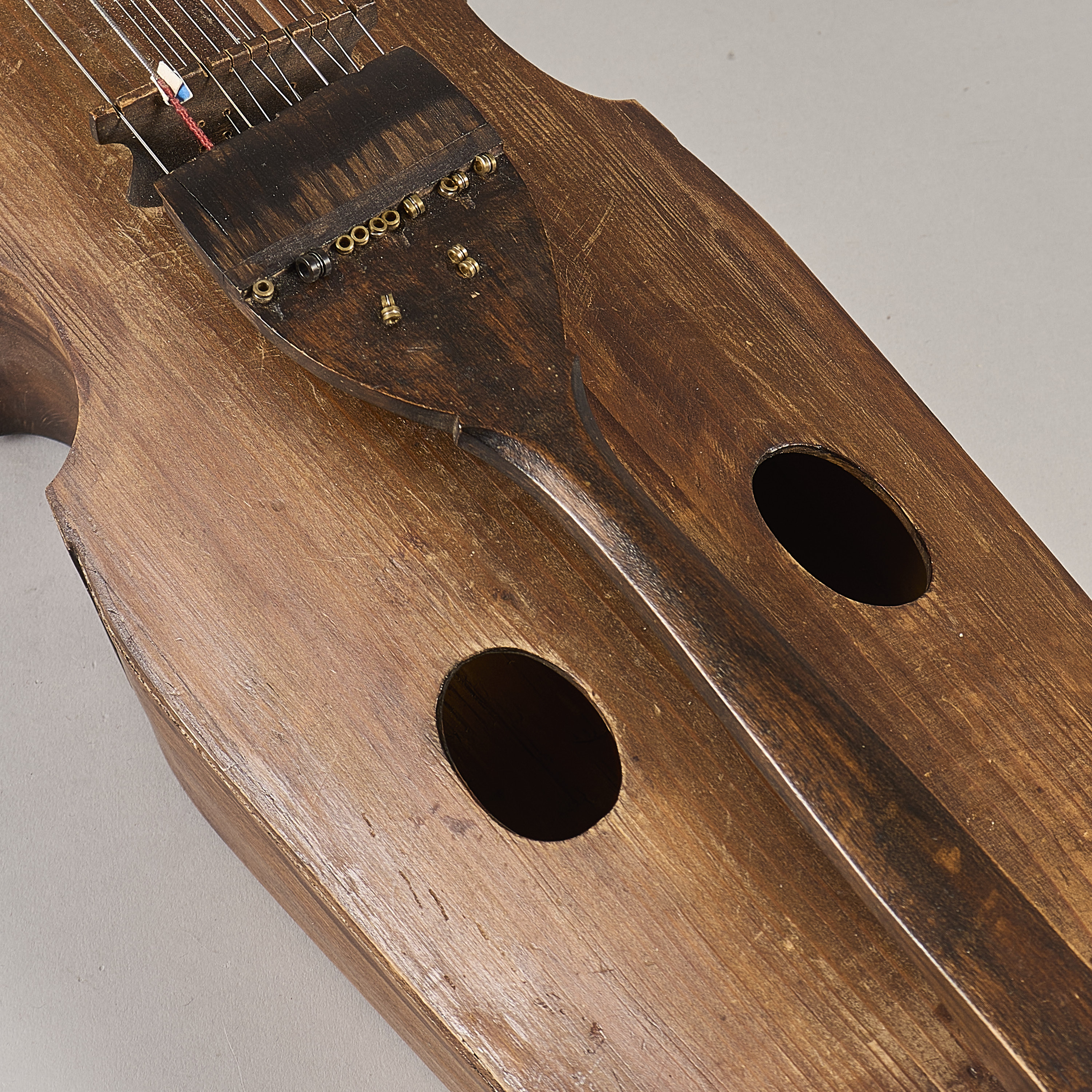 Kontrabasharpa, Jonas Spets (1841-1918), Morkarla, med väska. Längd: 87 cm, (öppen limfog), stränghållare limmad, förstärkning på insida av lock