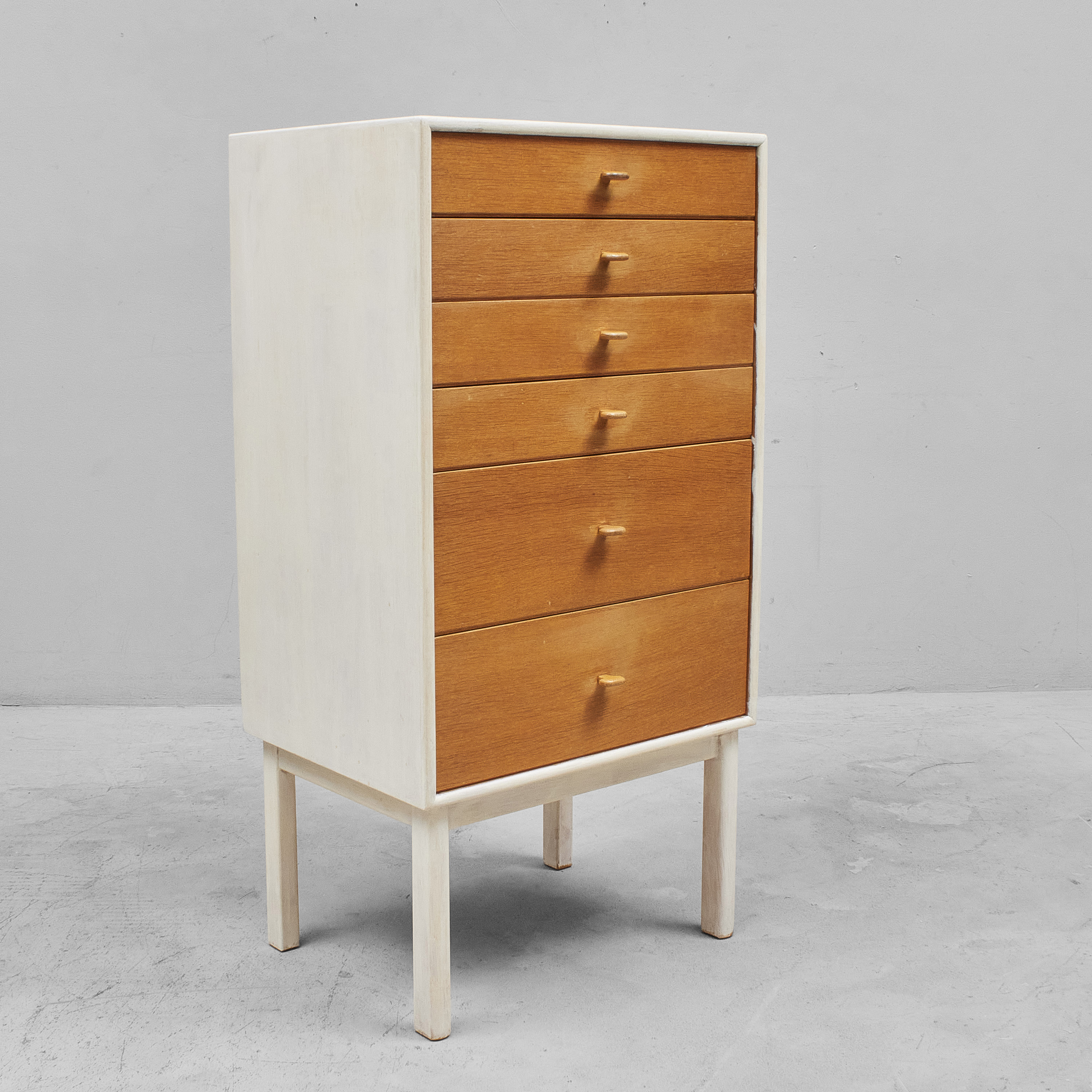 1950/60-tal, S. Engström och G. Myrstrand, AB Svenska Möbelfabrikerna i Bodafors, 6 lådor, teak. Bredd: 60 cm, du. 45. Höjd: 118 cm, stämplad