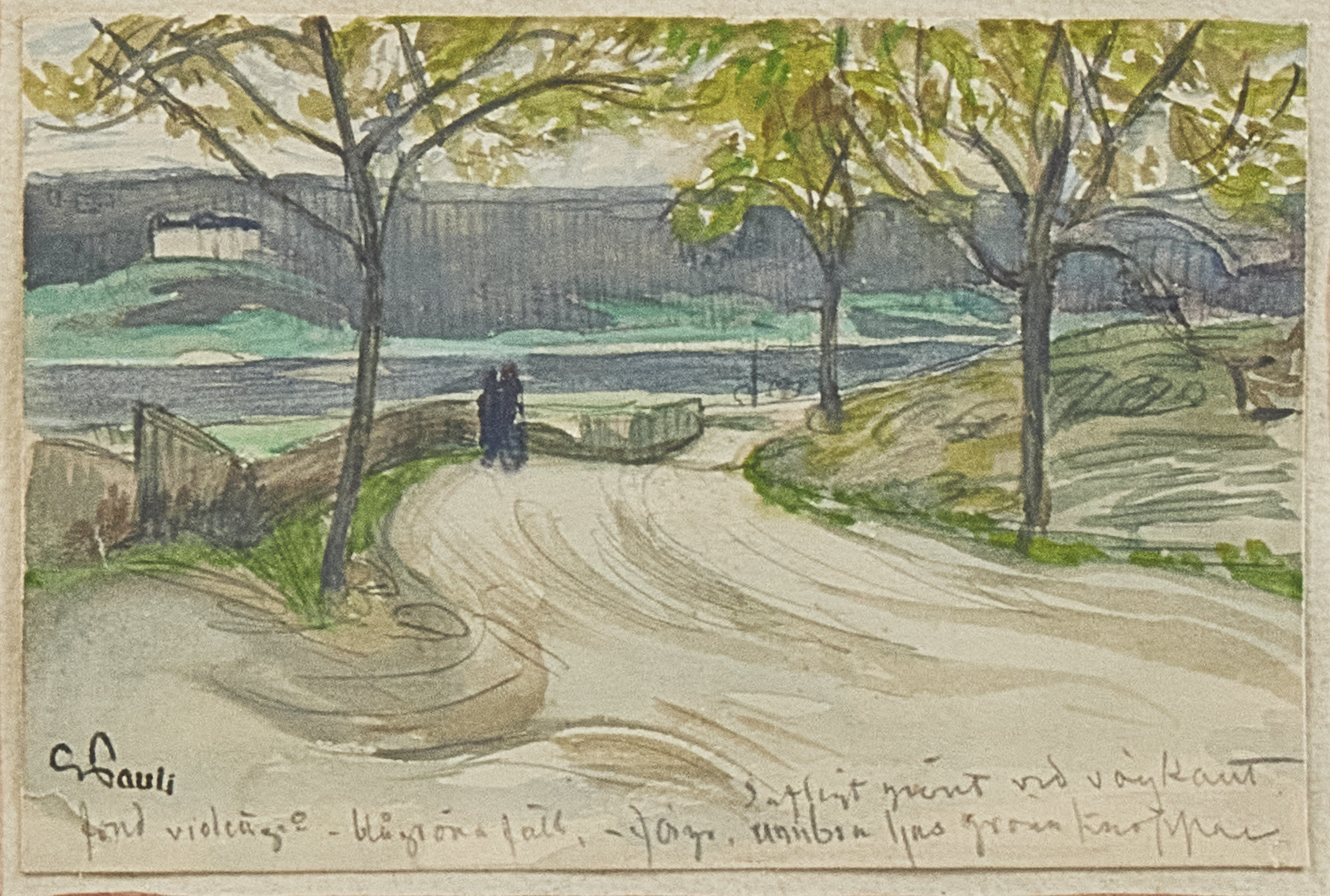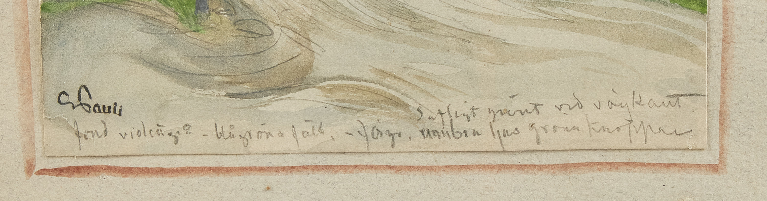 Georg Pauli (1855-1935), Sverige. Väg. Signerad. Akvarell, skiss. Blandteknik, bildmått: ca 11x17 cm, yttermått inklusive ram: 27x32 cm. Georg Pauli bodde på Värmdövägen 205 i Storängen, reva