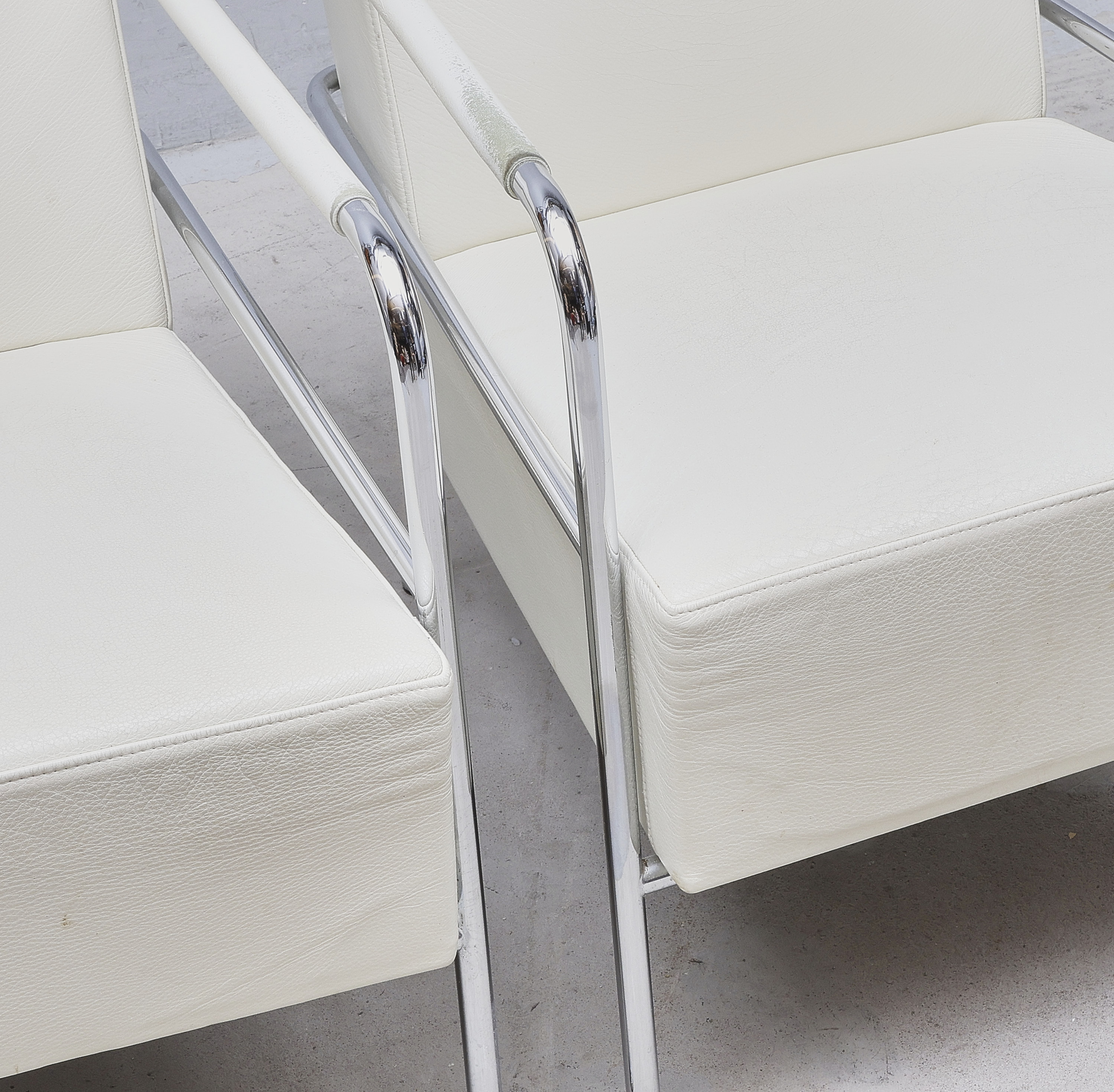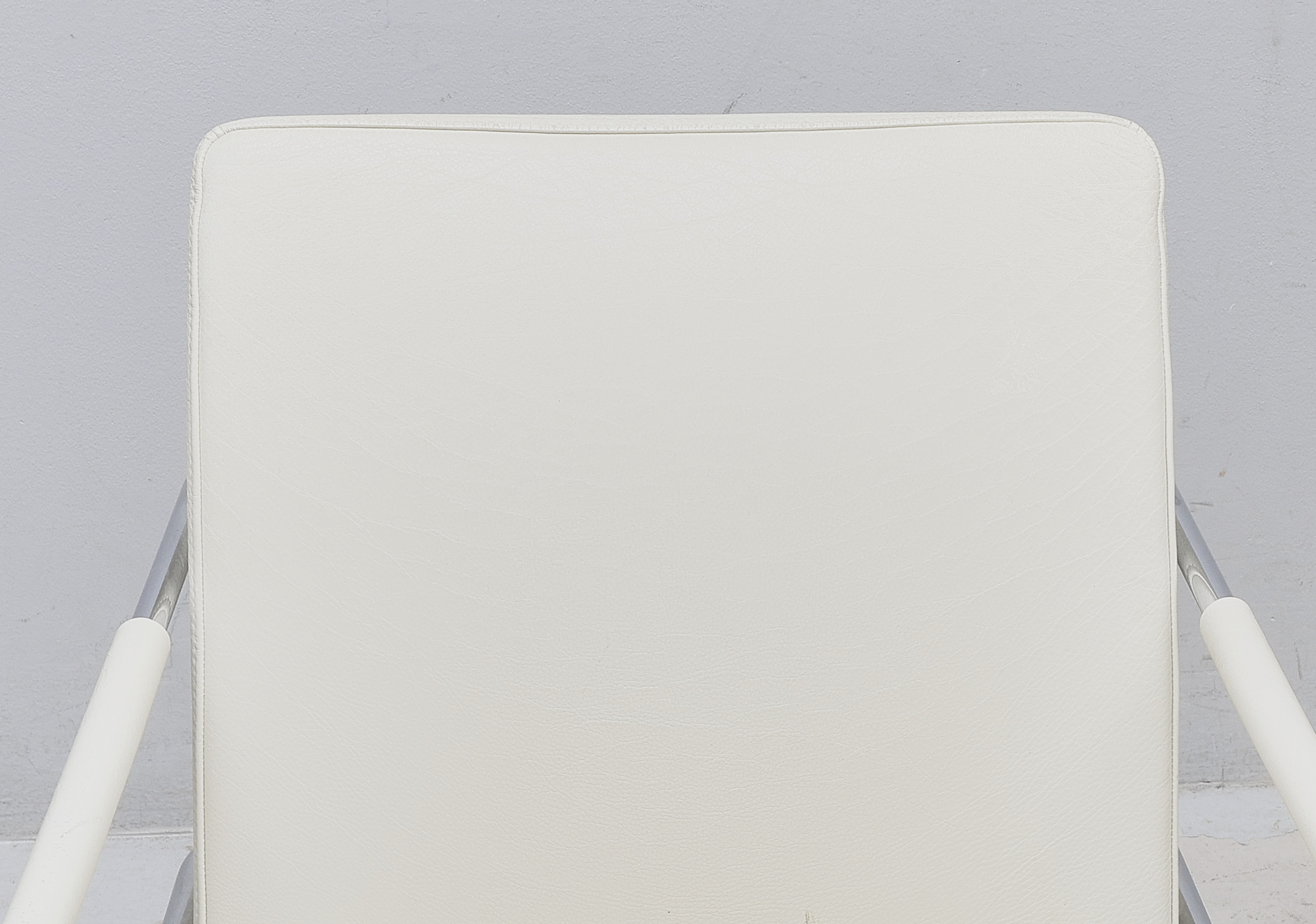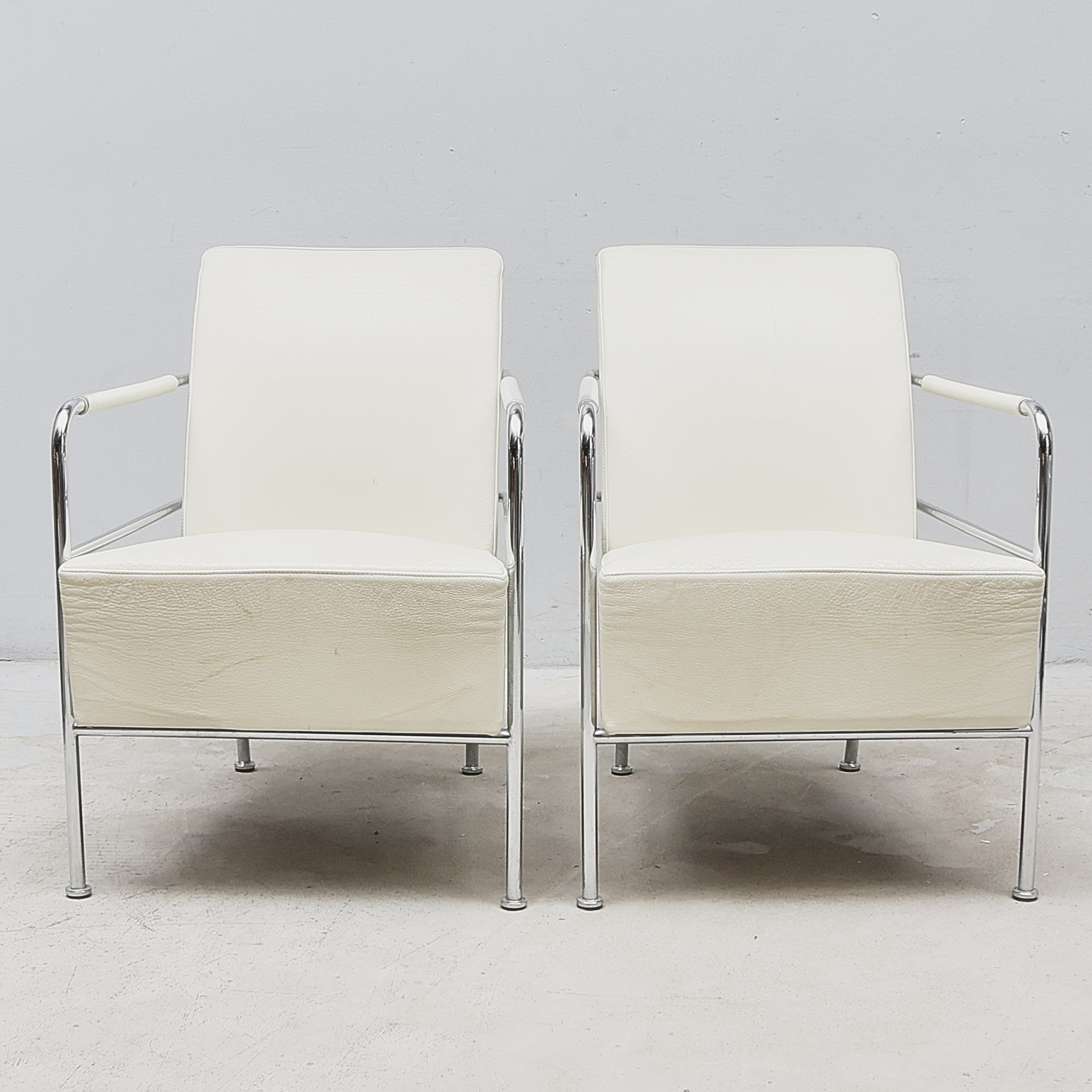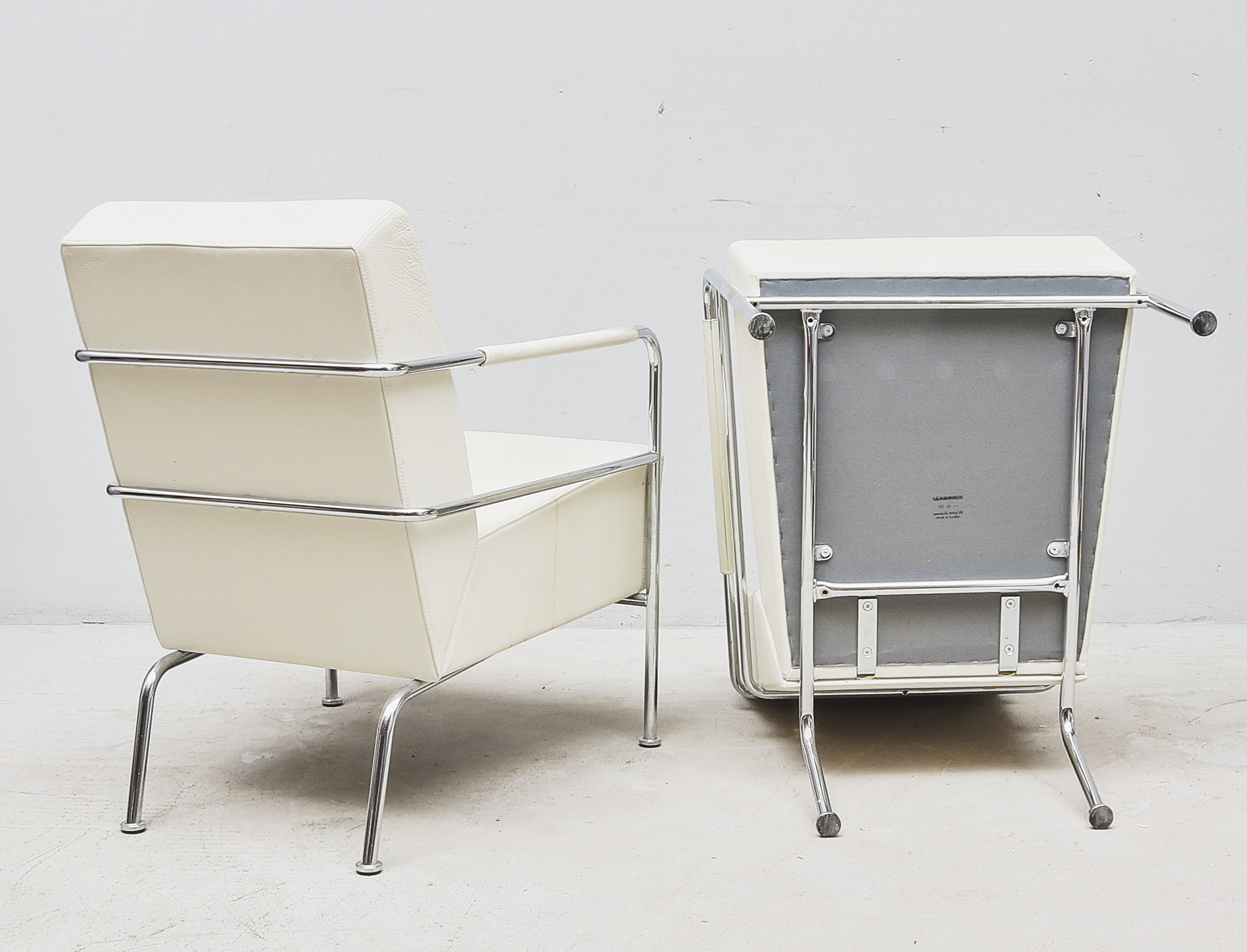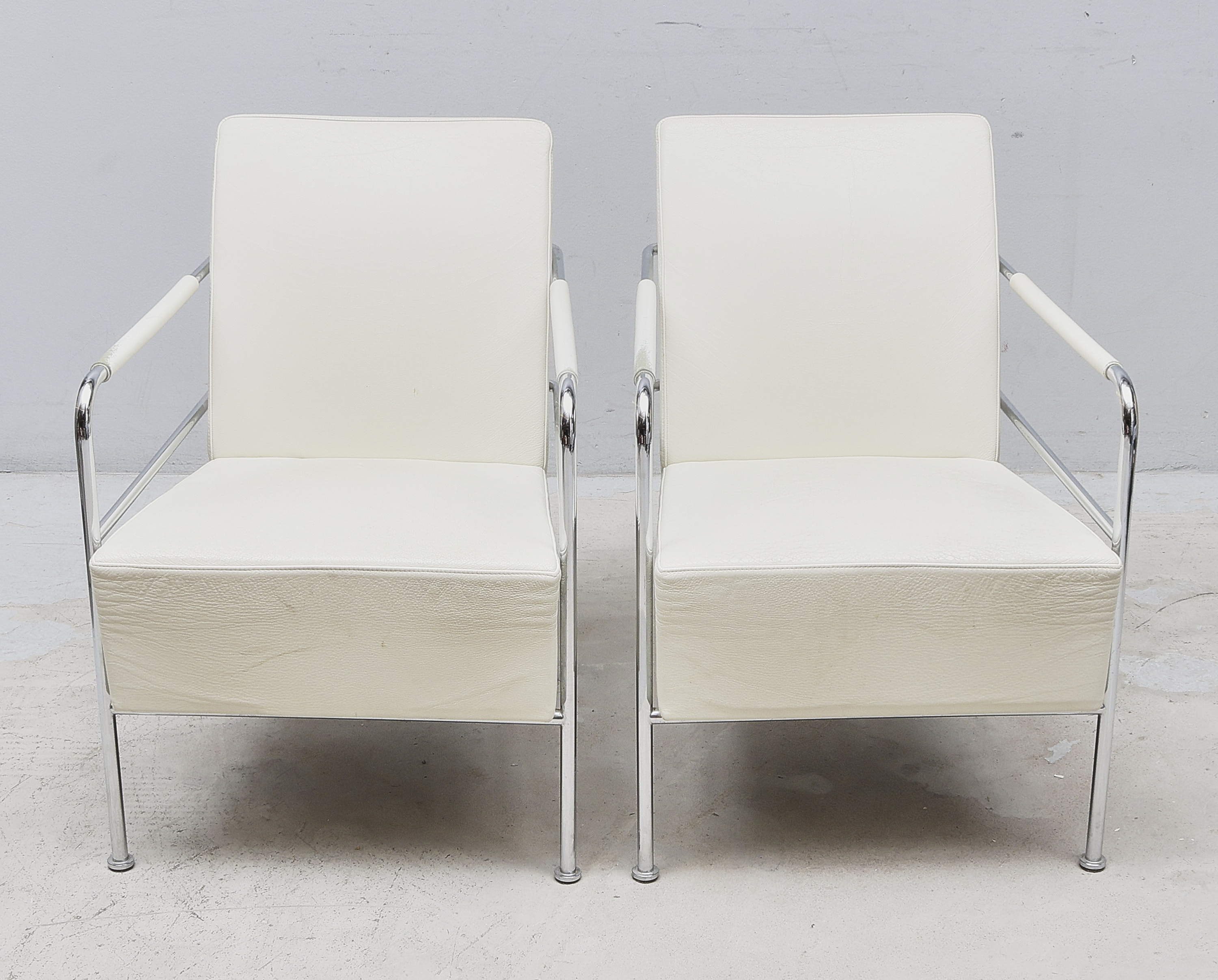 Ett par, Gunilla Allard (f. 1957), Sverige. Lammhult, "Cinema", kromat underrede, fast stoppad klädsel i vitt skinn, Bredd 56 cm, djup 70 cm, Sitthöjd 42 cm. Höjd 78 cm, slitage