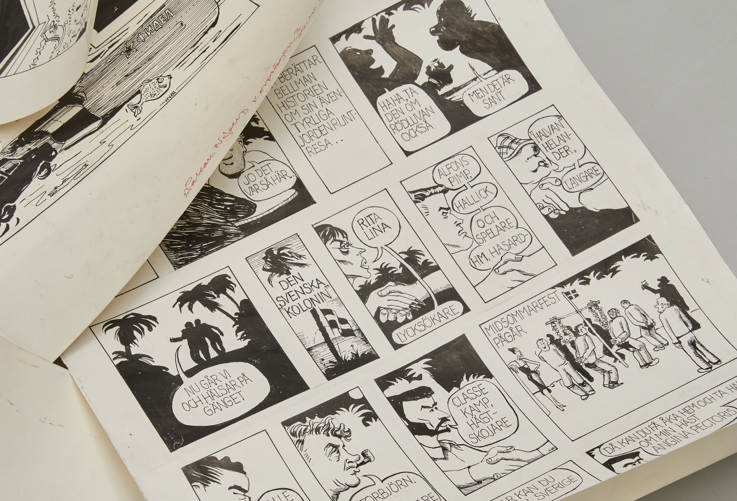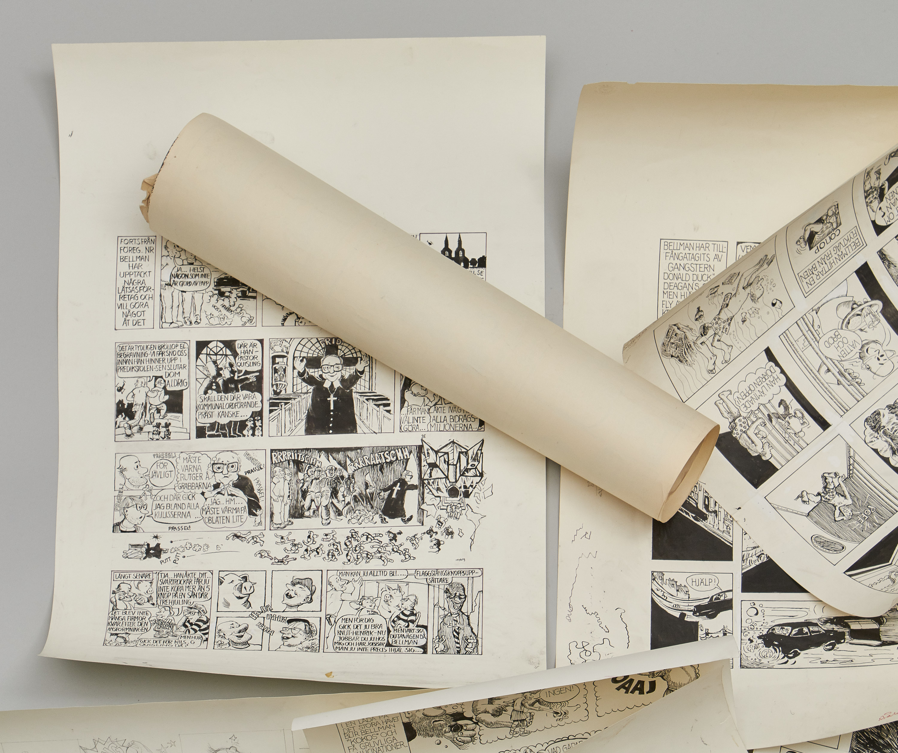 Håkan Nyberg (1938-2013), Sverige. Serieteckningar, 9 st. Tusch och blyerts, ca 40x60 cm