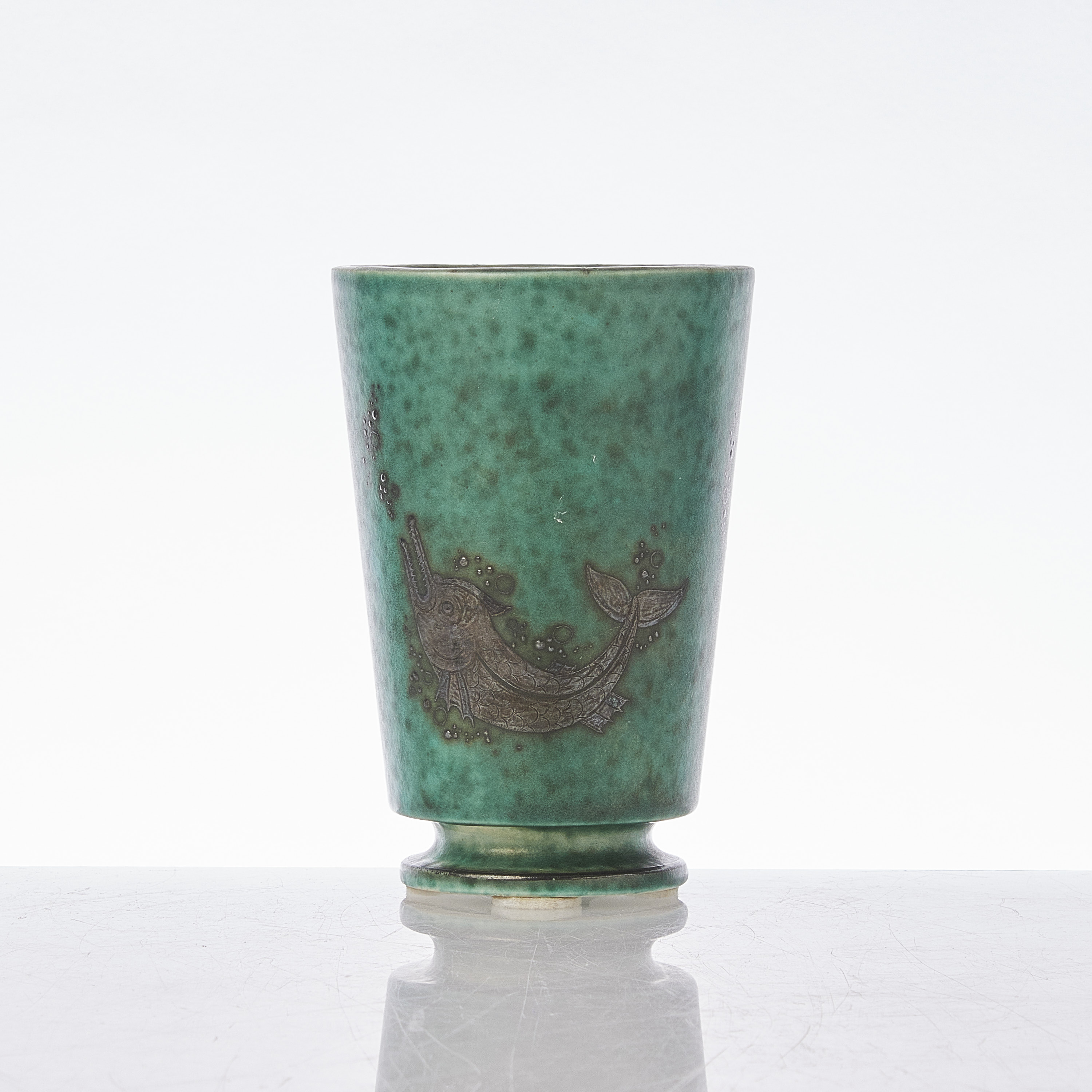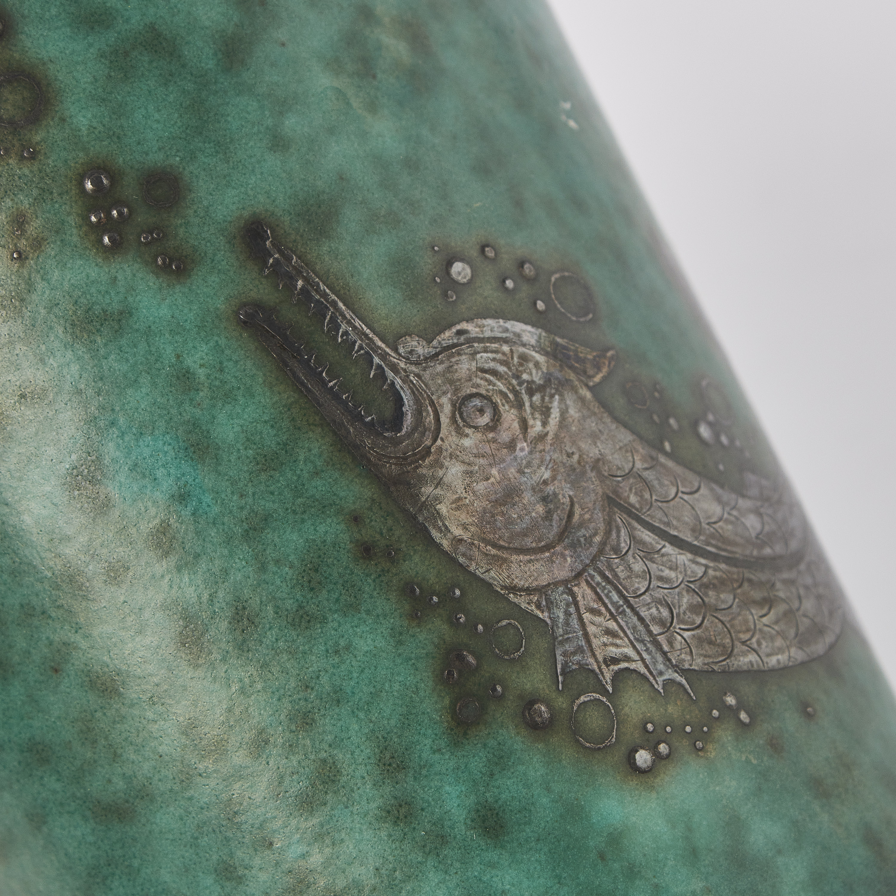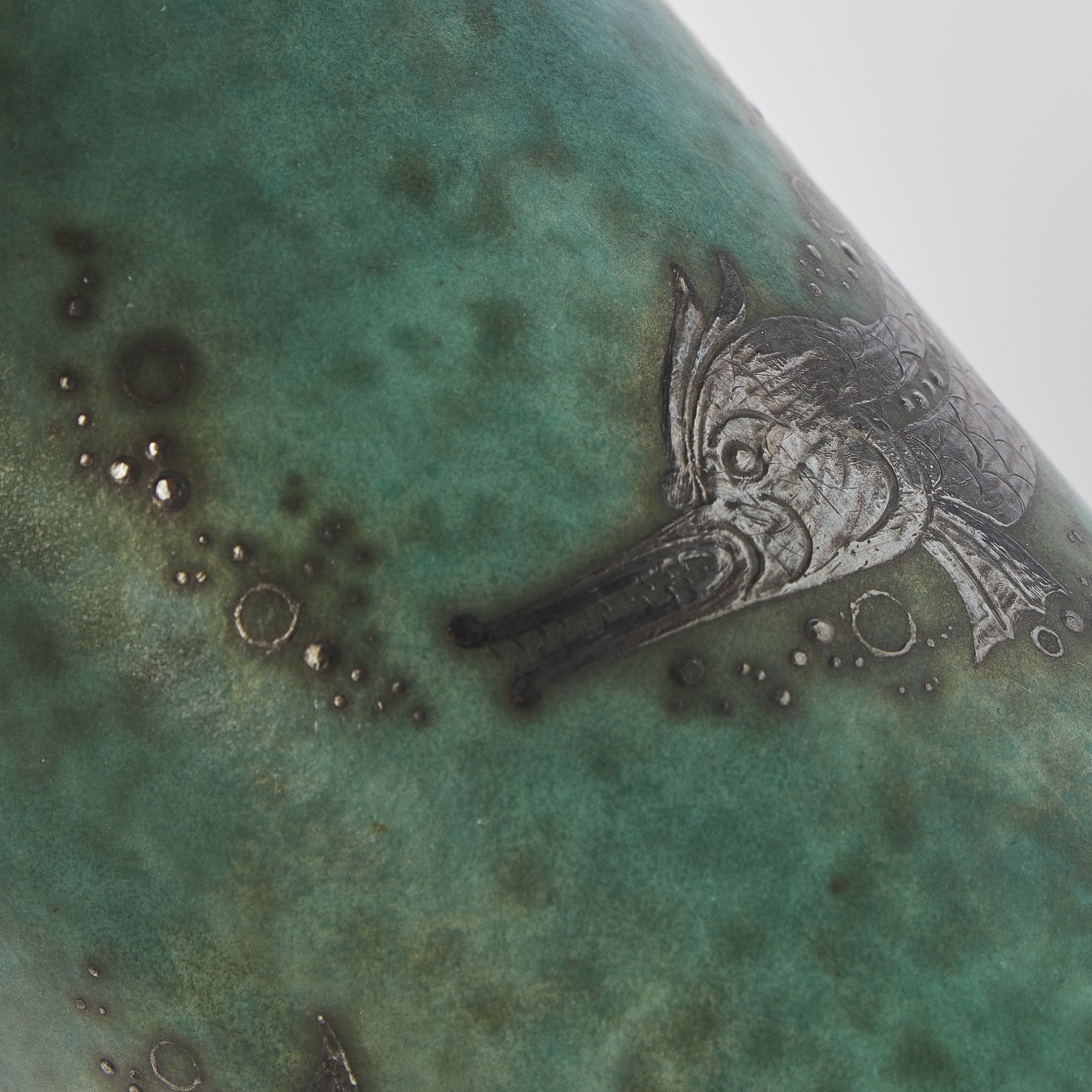Wilhelm Kåge (1889-1960), Sverige. Argenta, Gustavsberg. Stengods, grön glasyr med målad silverdekor. Höjd: 14 cm
