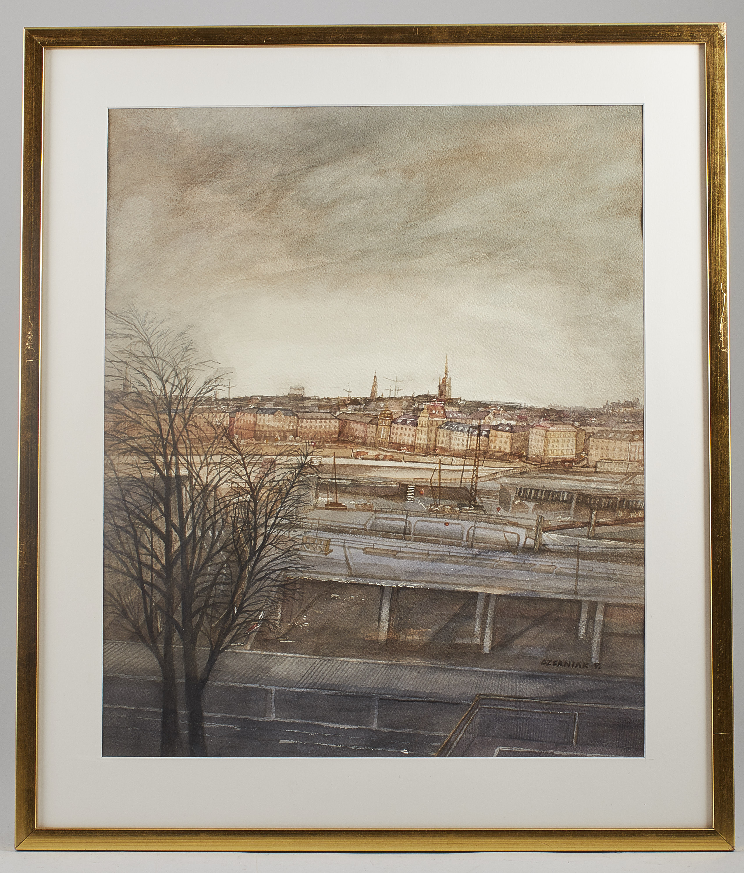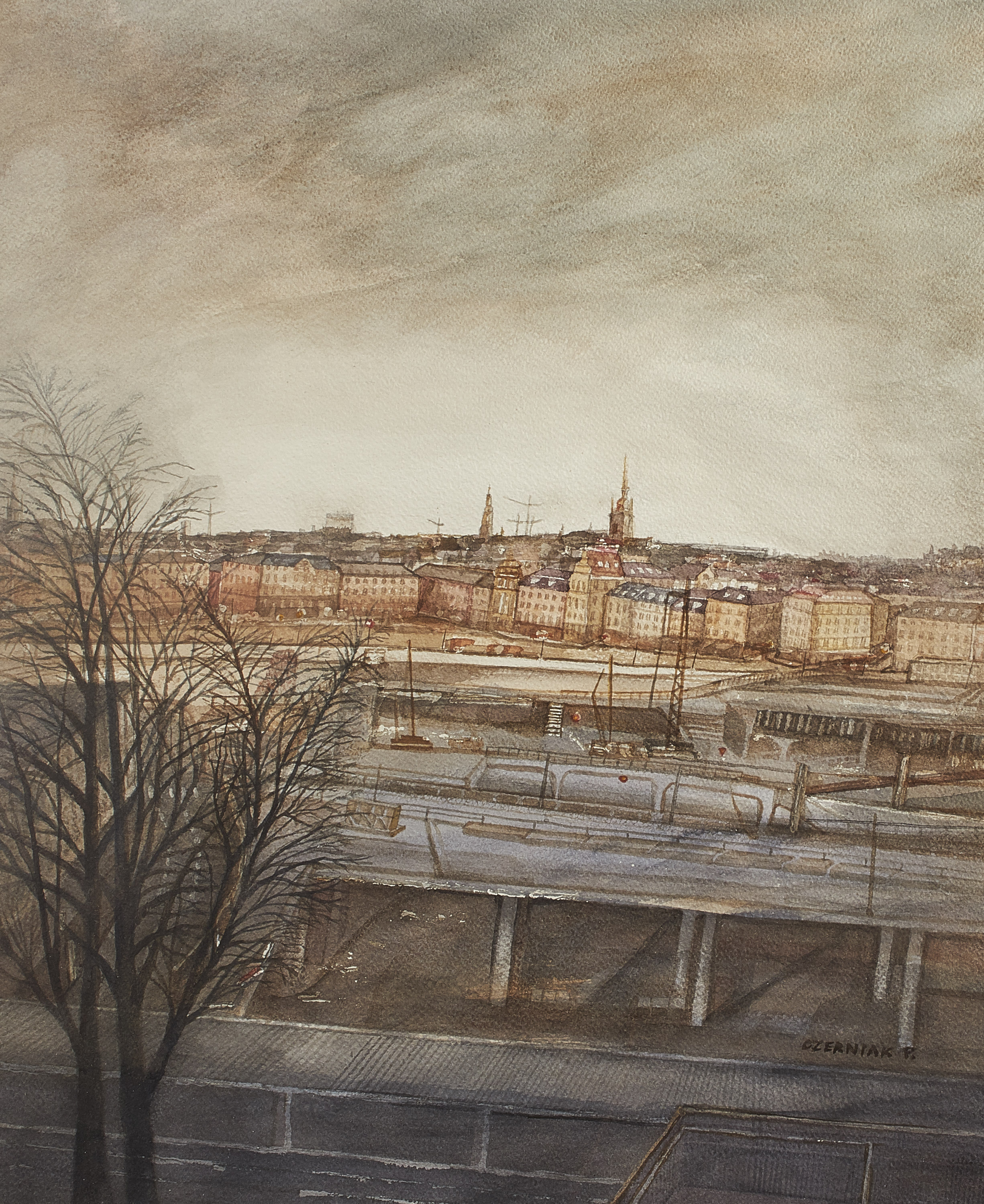 Peter Czerniak (f. 1947), Sverige. "Det sista trädet", Slussen, Stockholm. Signerad, akvarell. 57x47 cm