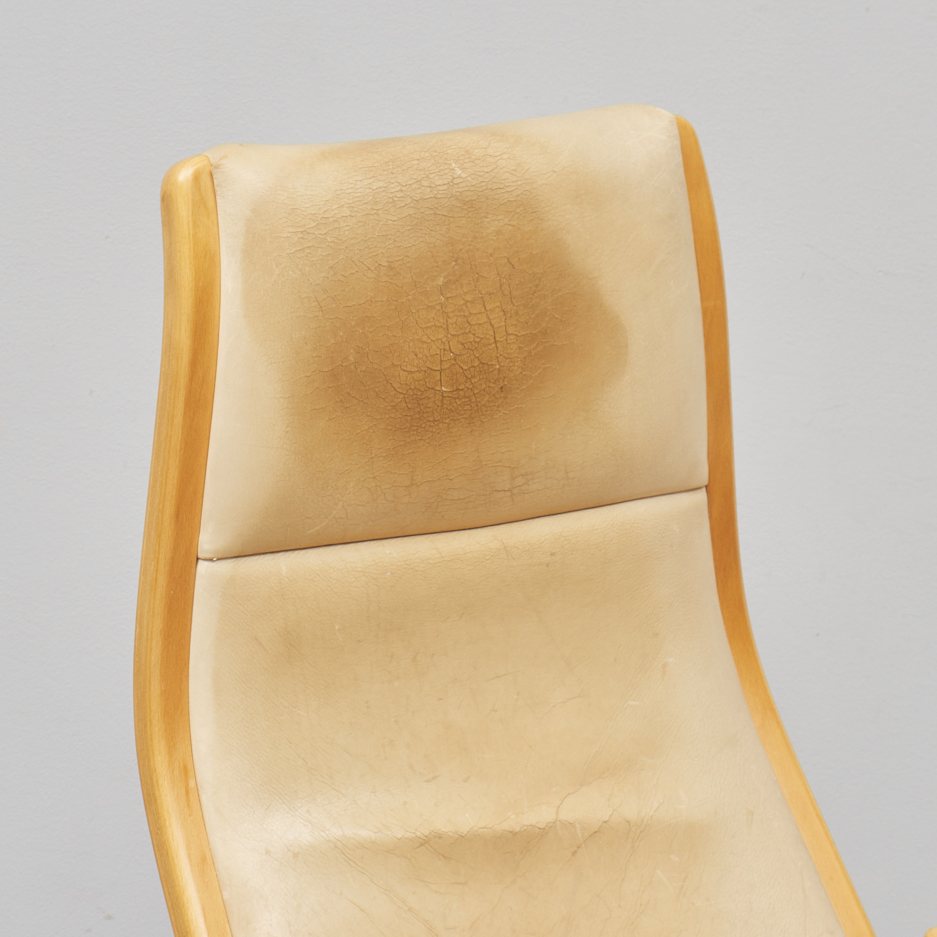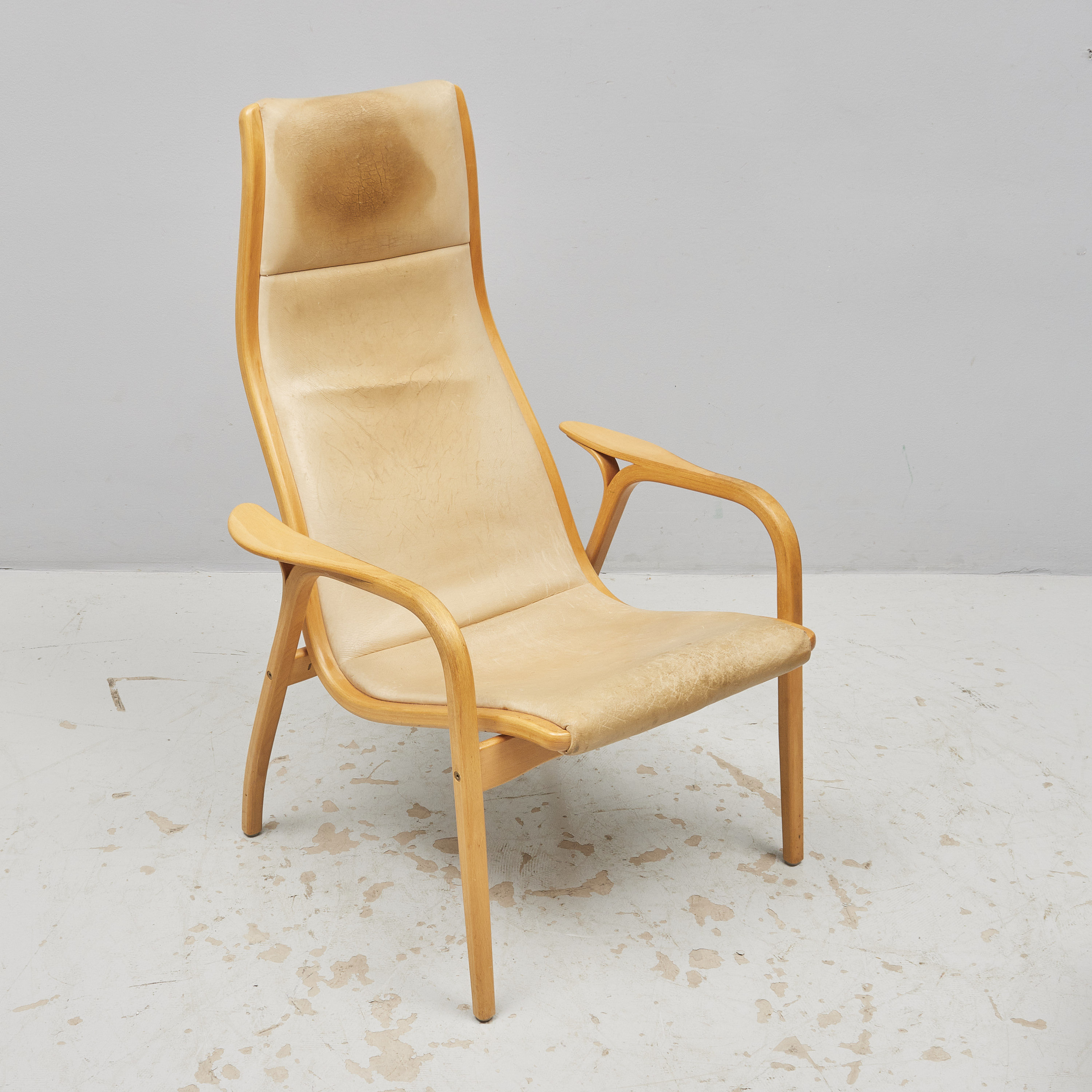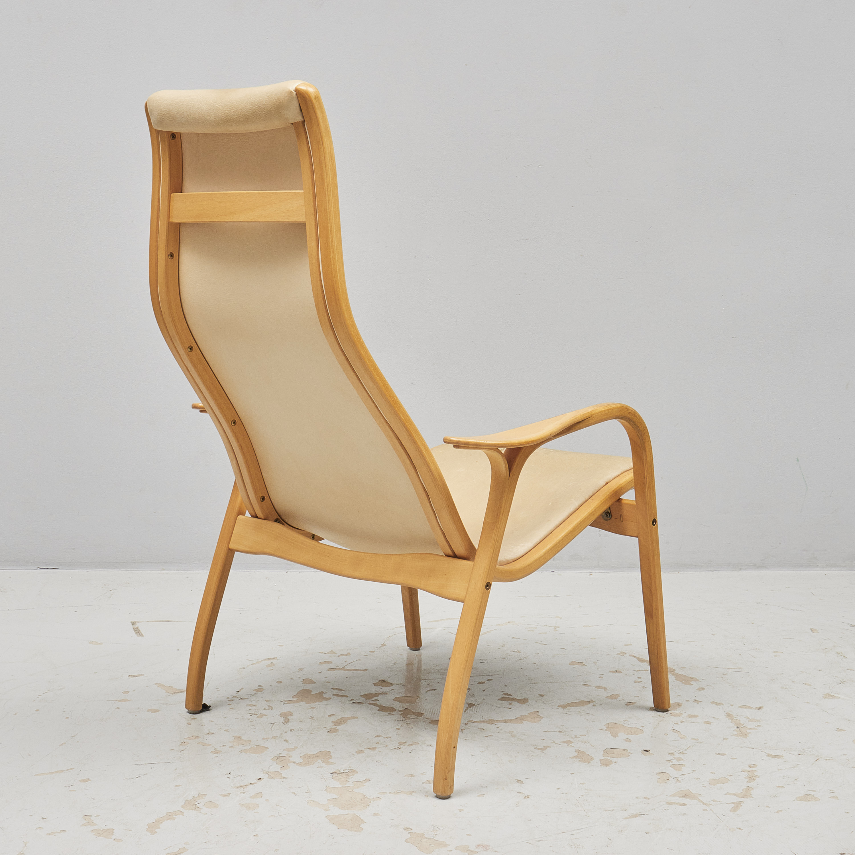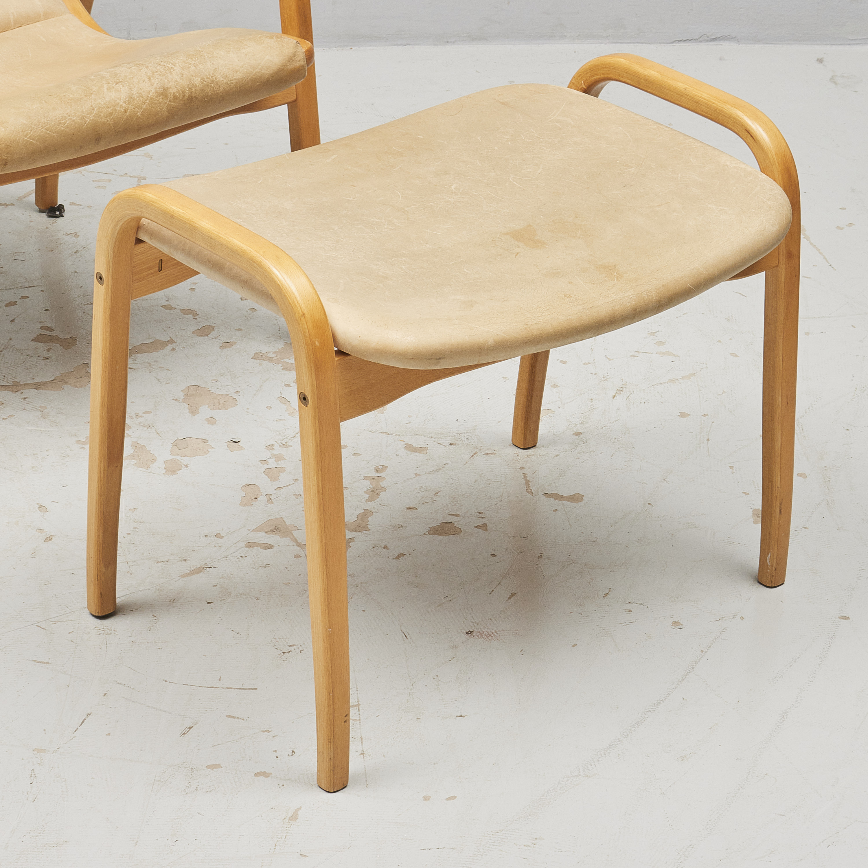 + fotpall. Yngve Ekström (1913-1988), Sverige. Lamino, Swedese. Sits i cremefärgat läder, stomme i skiktlimmat och formpressat trä, brännstämplad Swedese, slitage