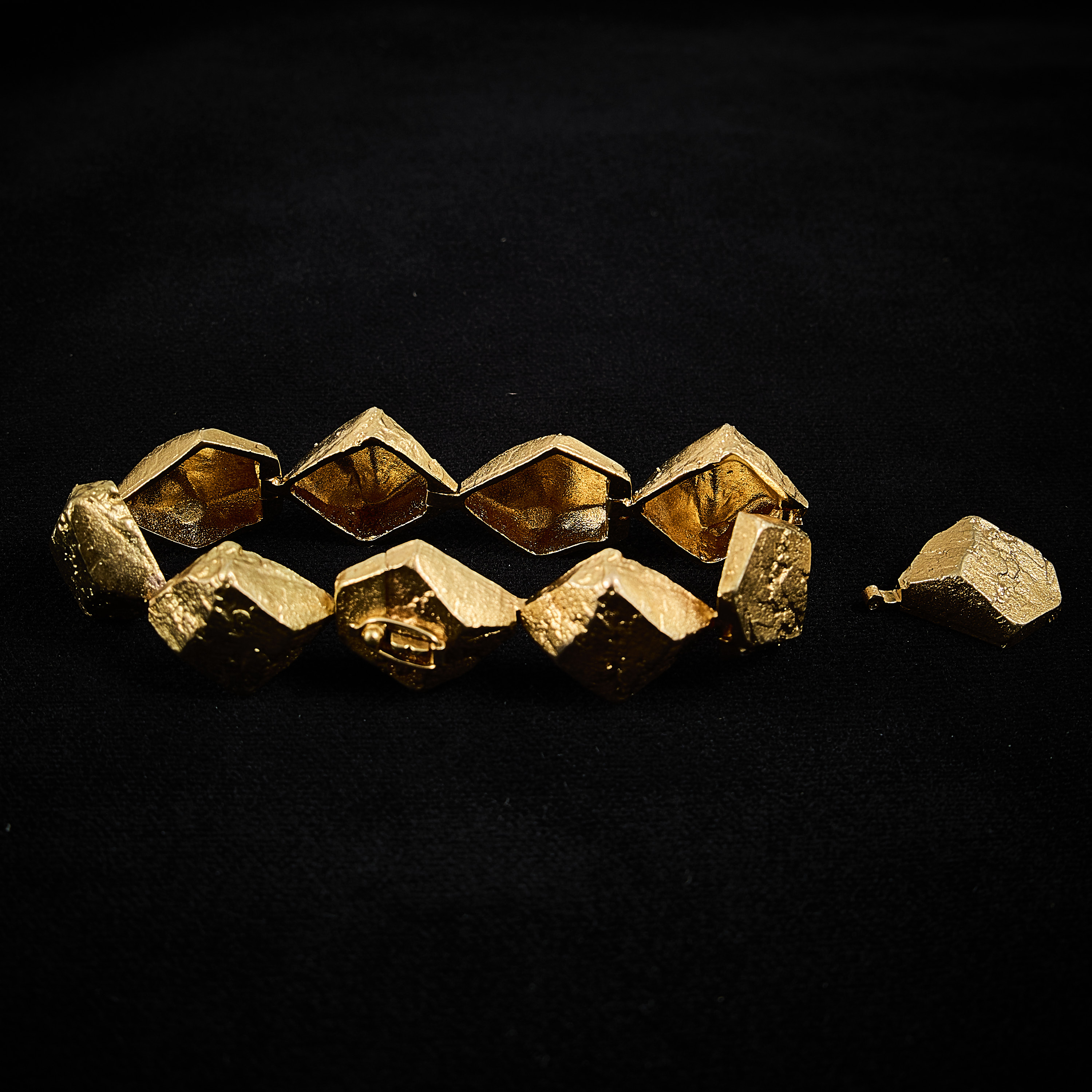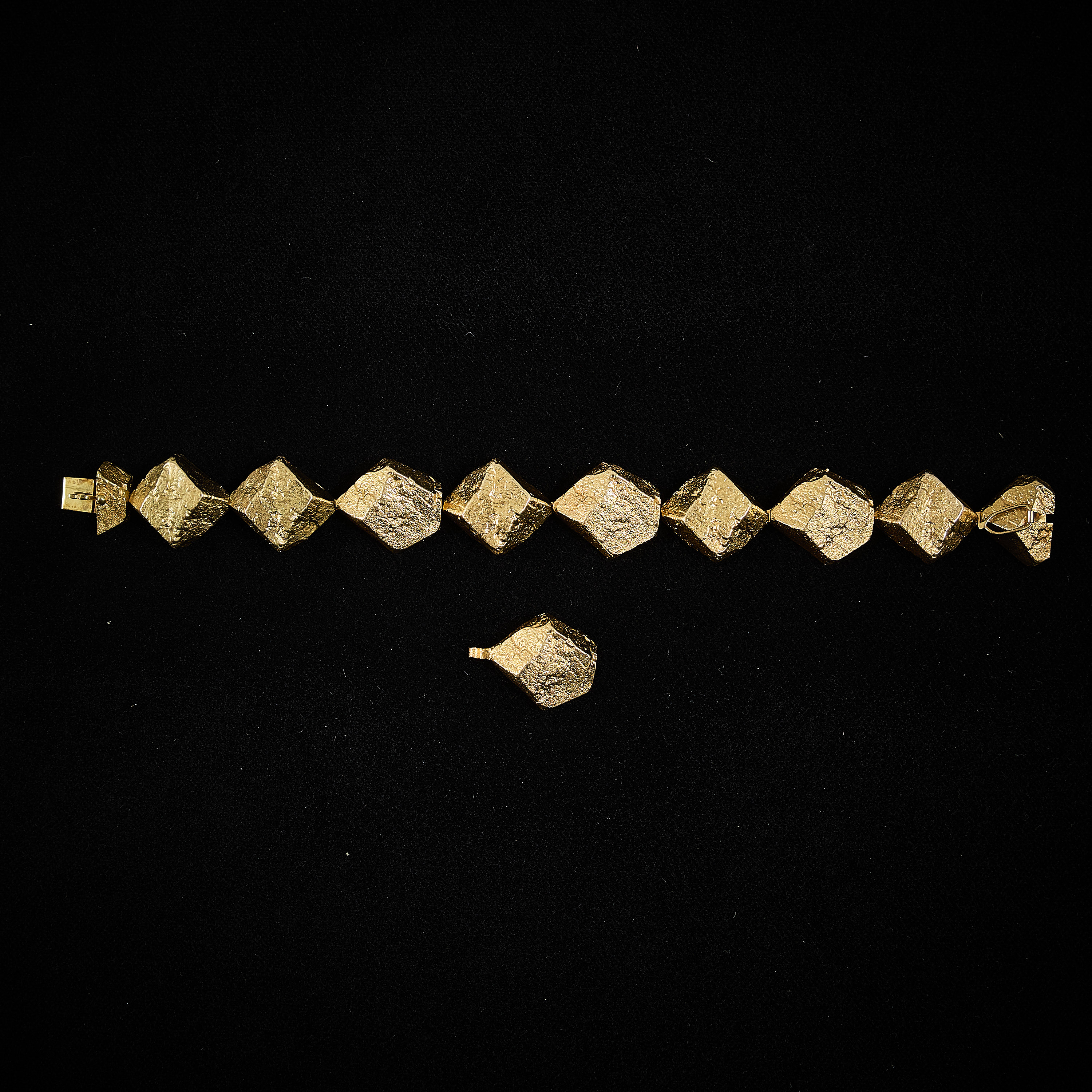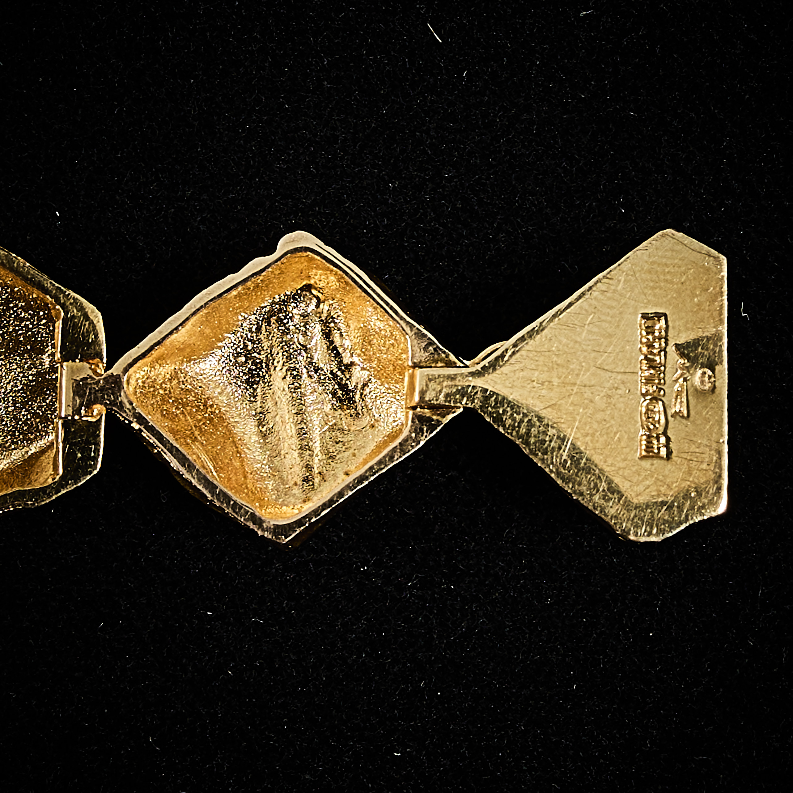 18k guld, Björn Weckström (f. 1935), Finland. Lapponia, "Lapplands stenar". Längd: 17,5 cm. Bredd: 1,5 cm ca, medföljer 1 extra länk om ca 2 cm. Vikt: 48,4 g, stämplad BW
